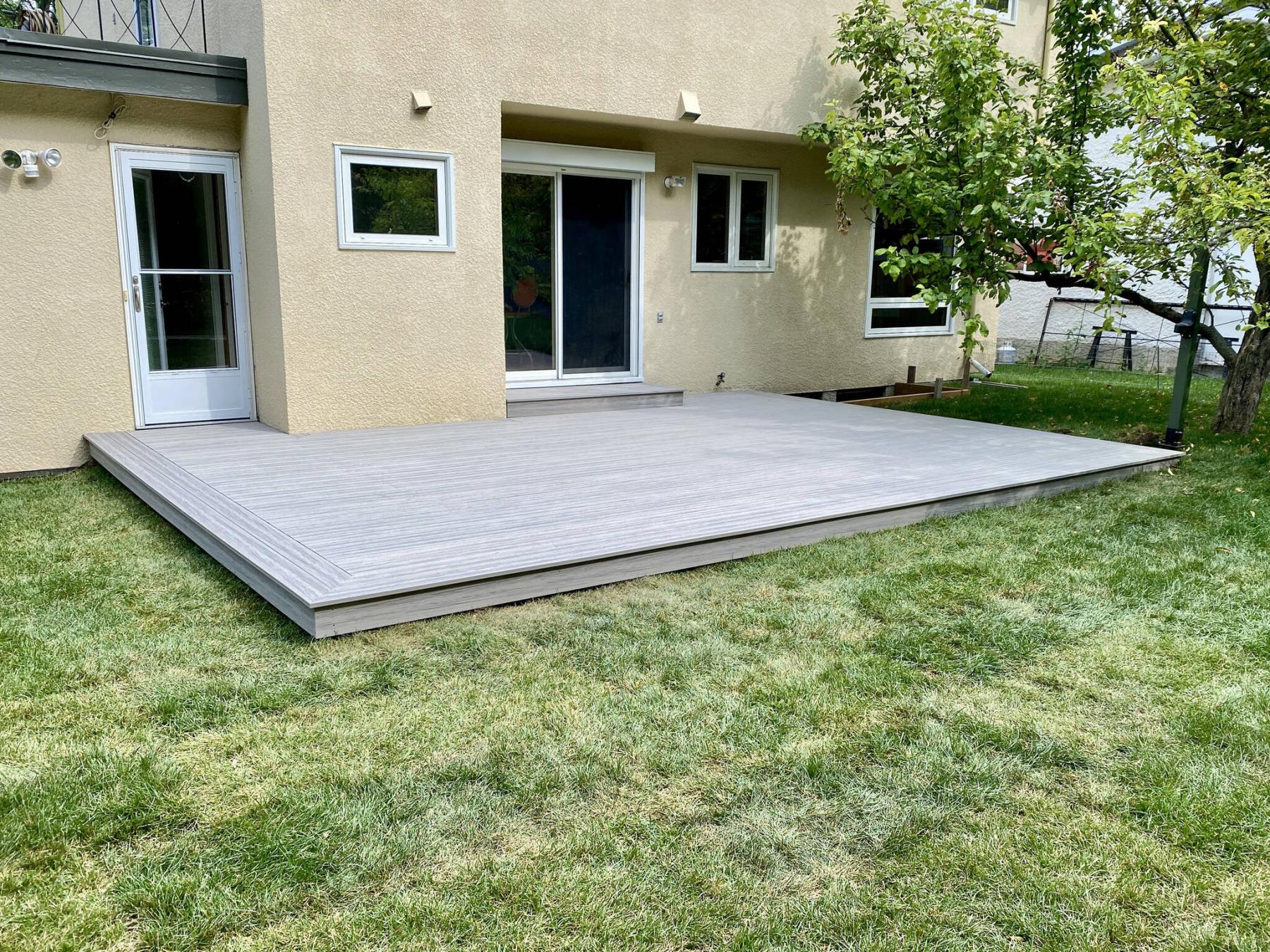 This ground-level deck was decoratively sheathed in Tundra, a popular Deckorators.com composite product.