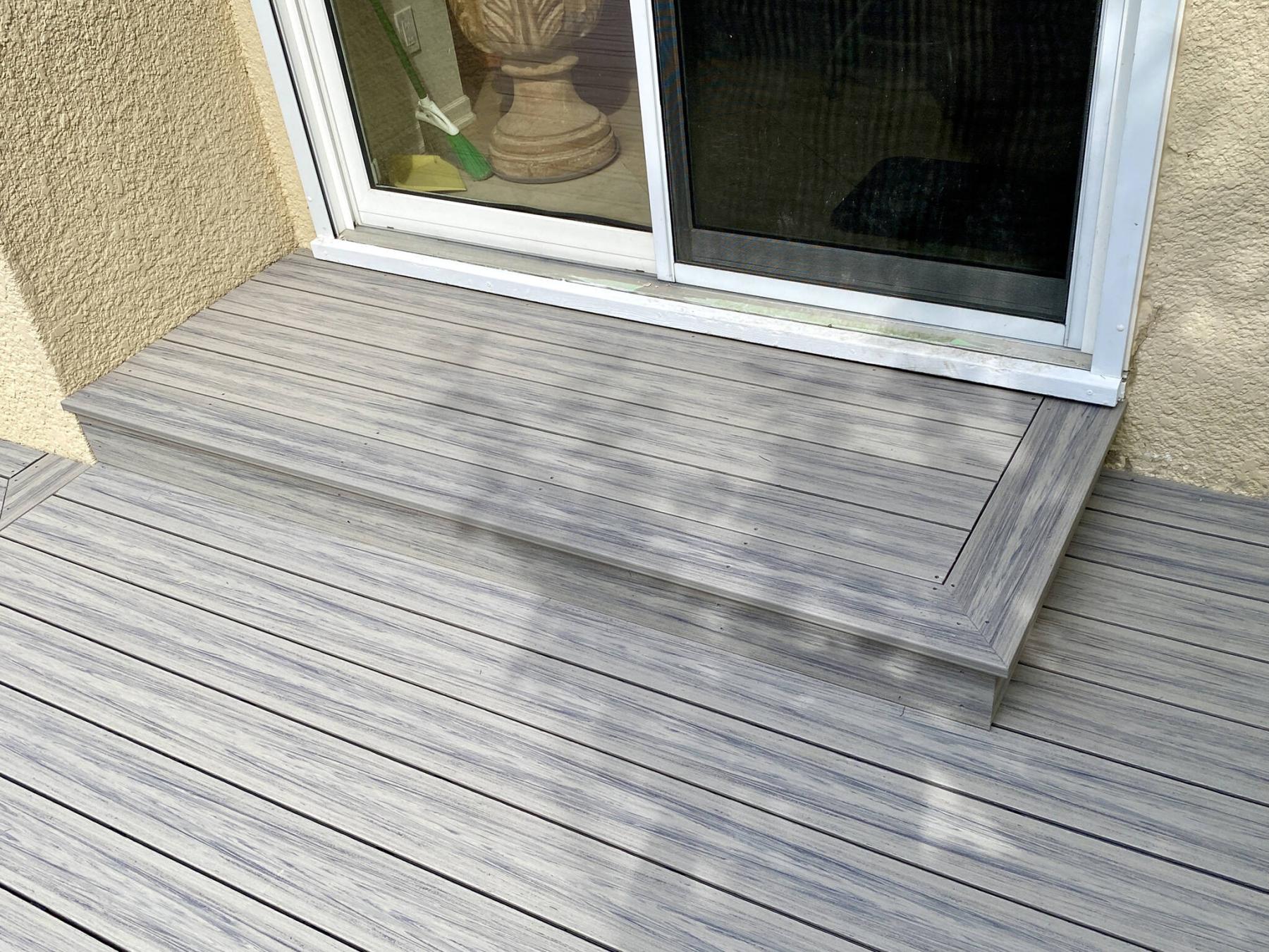 To meet the higher elevation of the sliding patio door, a removable landing was framed and sheathed in composite to match the design of the main deck