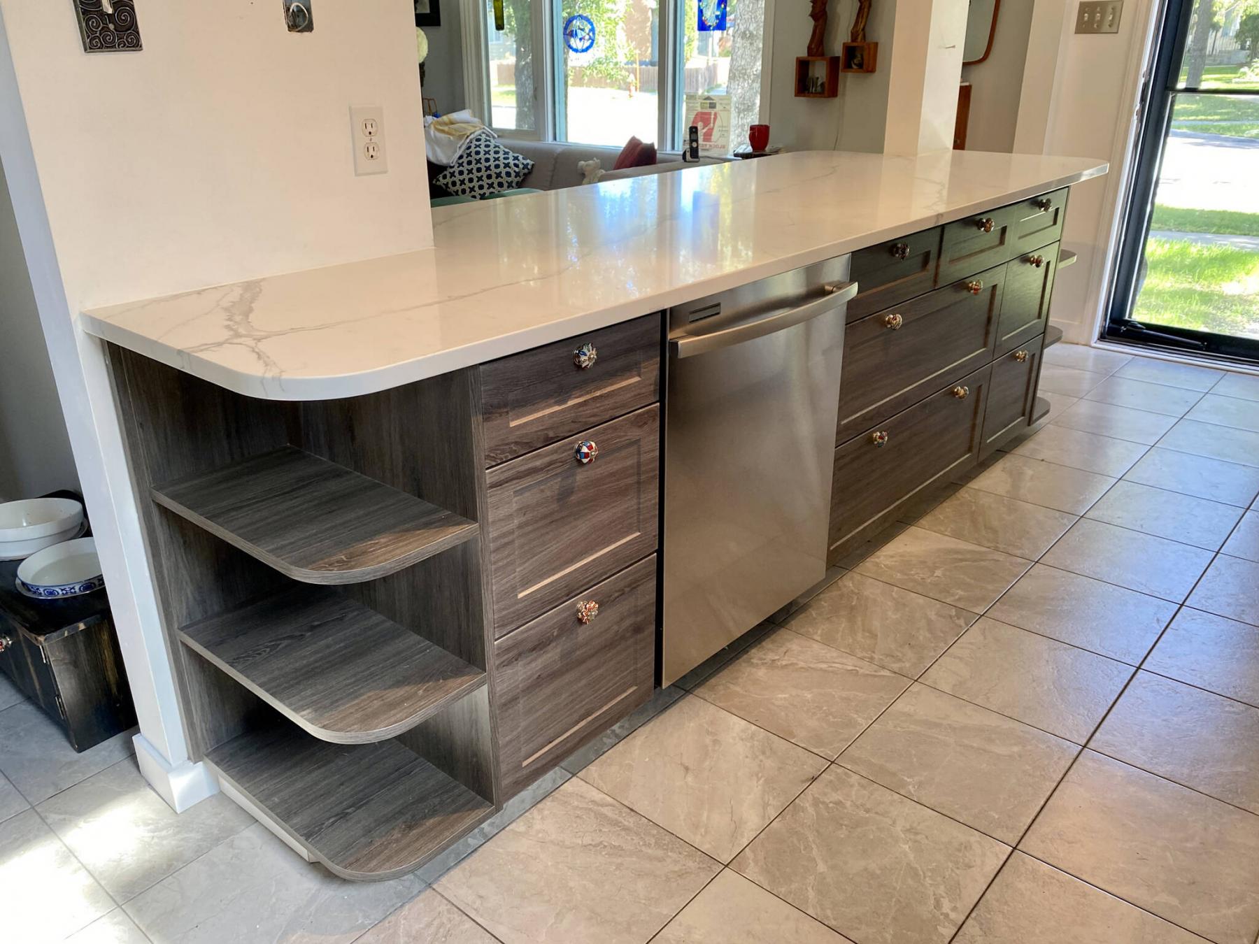 The existing cupboard doors and drawers were carefully measured and ordered prior to the installation date. Along with these cabinet faces, all trim, plant-on pieces and dividers, as well as the upper and lower valances would receive the freshened cupboard look. My good friends at Cabinet Corner did a fantastic job with all the individual cabinetry pieces. The countertop laser-template was then achieved, and the quartz countertops were ordered via Solid Stone Countertops. The details of the new sink placement were provided, and the quartz countertop would be pre-cut accordingly.