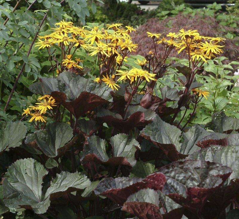 Britt Marie Crawford ligularia has voluptuous foliage and startling mustard yellow blooms.