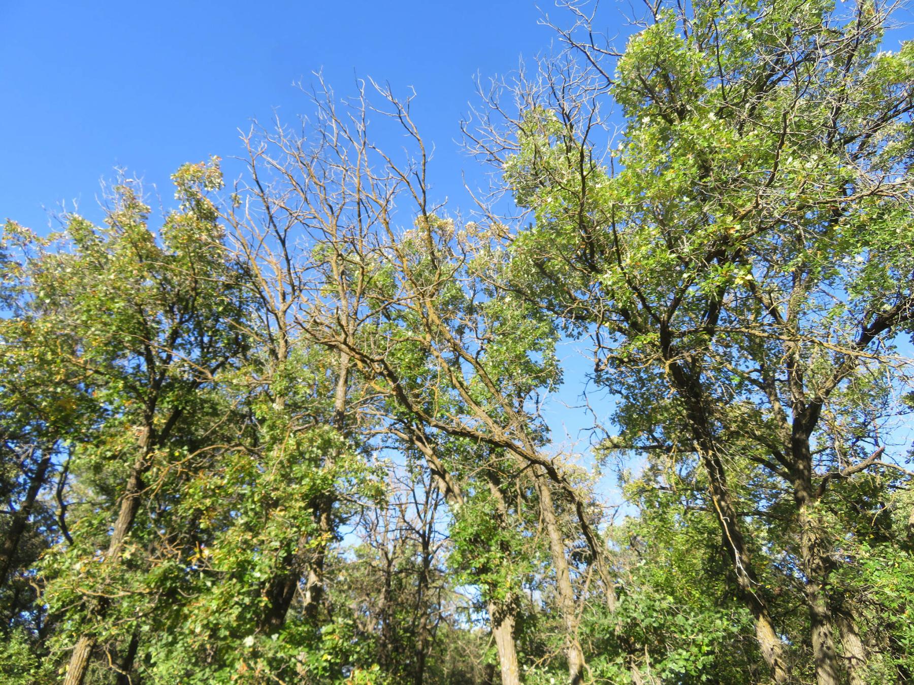 Stressed bur oak trees with visible signs of dieback at the top of the tree canopy are more susceptible to the two-lined chestnut borer.
