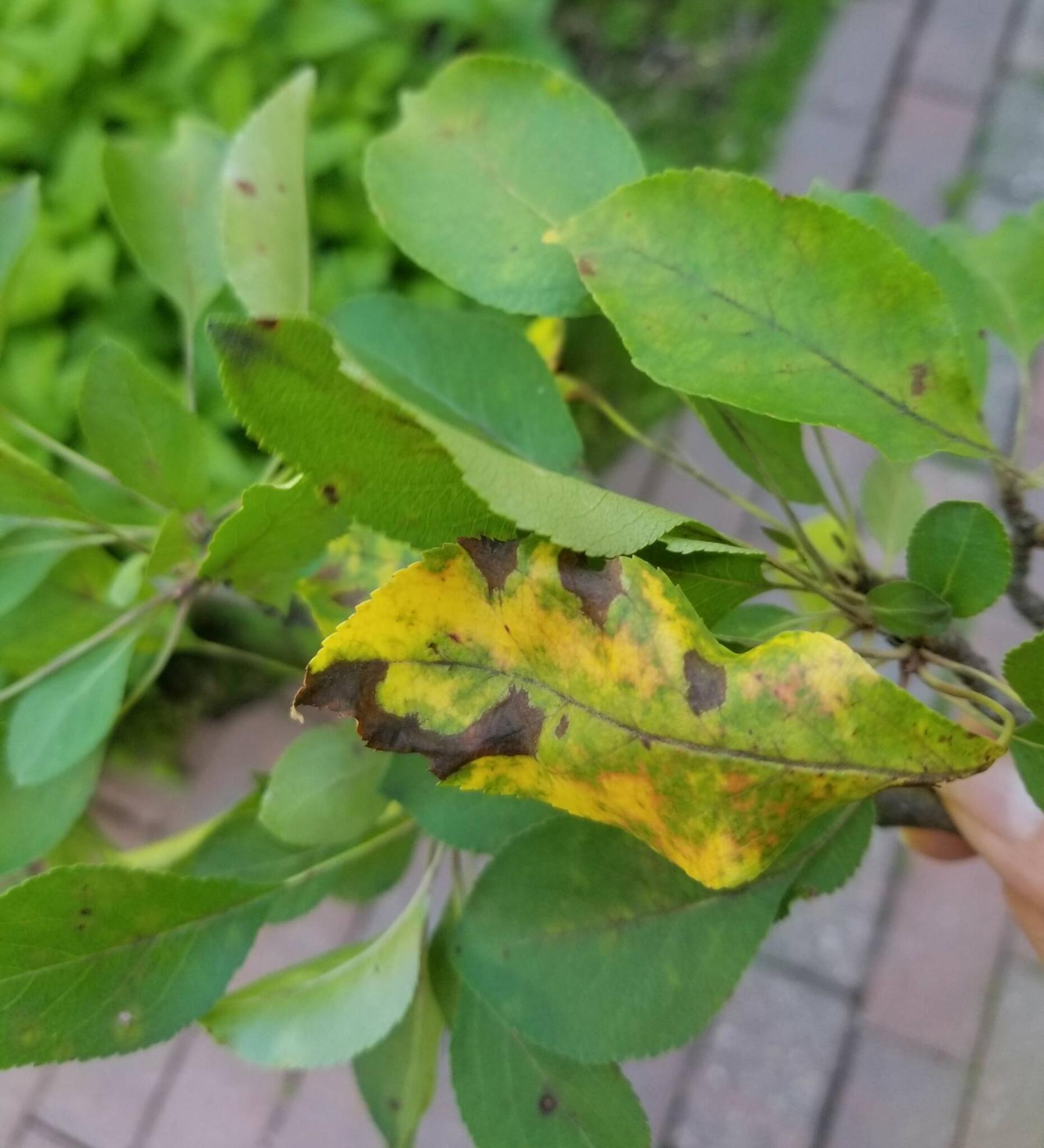 Apple scab is caused by a fungus that infects both the fruit and leaves of apple and crabapple trees.