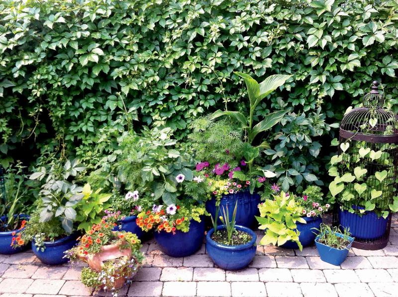 An illusion of depth in front of the living wall is achieved by layering a mix of cobalt blue and terra cotta containers planted with a variety of textures and colours including cosmos, ornamental grasses, and nasturtium and trailing ivies.