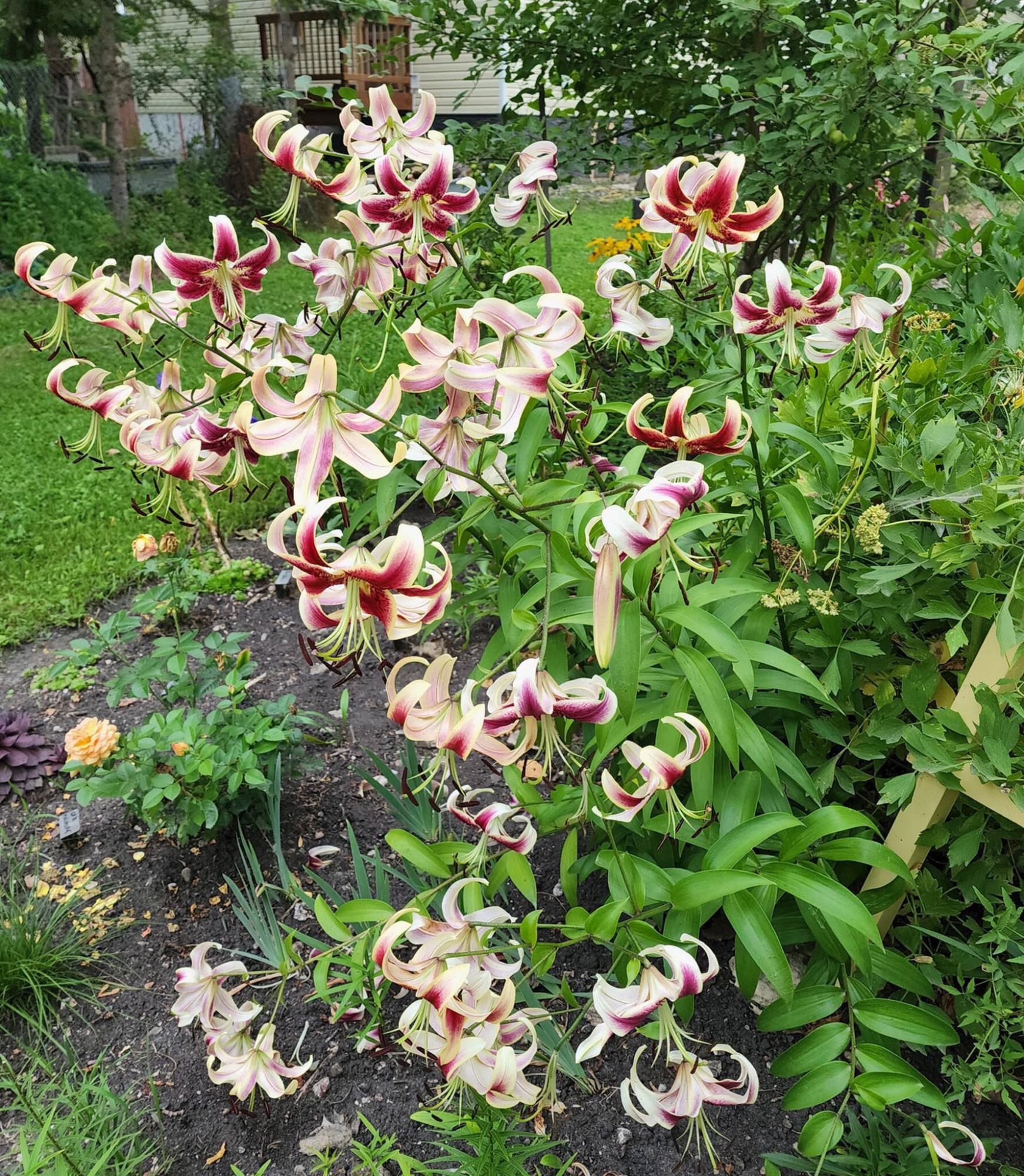 “The Asiatic lily prefers full sun. It also prefers spacing between bulbs and benefits from being divided and transplanted every 3-4 years to retain their health and vigor. Once the bulb begins multiplying beneath the soil surface, crowding will start to produce shorter stems with smaller flowers. Dig up the whole clump, separate the bulbs, and replant.” There are different bloom periods for lilies depending on the type you grow. It is possible to have lilies blooming in your garden from the end of June through to August or into September. Lilium Scheherazade, for example, is an orienpet (oriental x trumpet) hybrid lily that blooms mid to late summer. Plant lilies in groups.