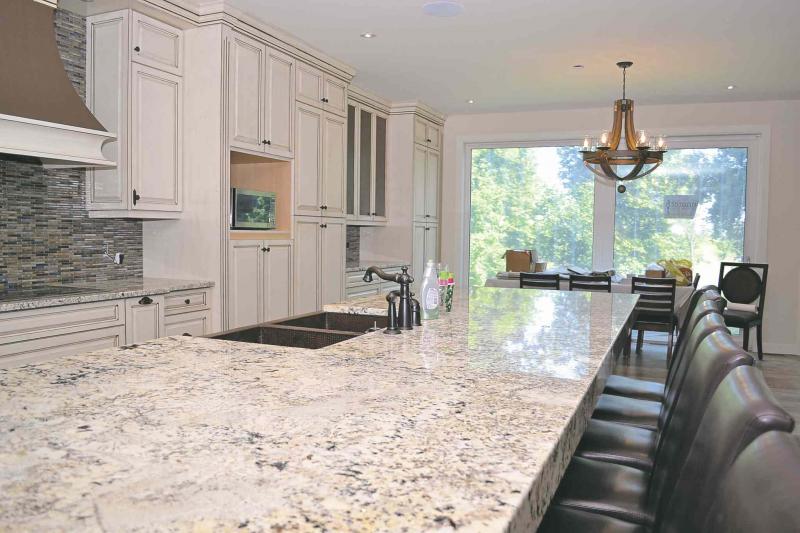 RB Millwork built most of the cabinetry in the house. Throughout the kitchen, the cabinets are distressed maple and cherry to echo the traditional theme of the design. A dark stained cherry island reflects the deep brown of the beams in the great room. The island and kitchen countertops are light champagne granite which picks up the sand tones of the LVP flooring.