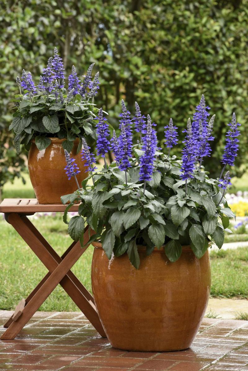 The flower spikes of annual salvia are useful for adding both a vertical dimension and rich, dark shades of continuous colour to your container designs. Mystic Spires Improved is meant to be exactly that — an improved annual salvia with longer flower hold and a truer blue colour with better branching for a larger number of flower spikes. Its height is significant at 46 to 61 cm and the dark green leaves are large and slightly downward facing. This is a bushy annual that could be planted solo in a container.