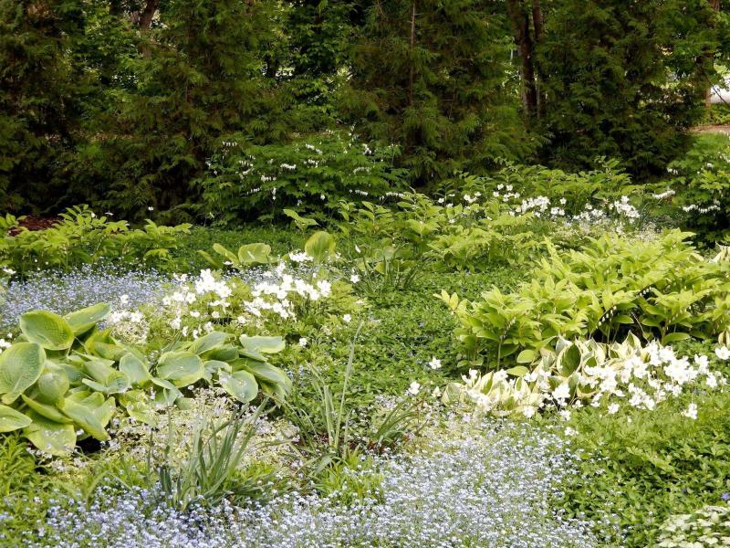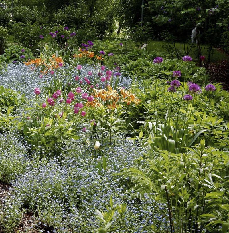 Densely planted drifts of Myosotis (forget-me-nots), Vinca minor, and Viola sororia Freckles provide an ocean of riveting blue colour which Litman has underplanted with puschkinia and several varieties of hyacinth, narcissus, and muscari for a mesmerizing display each spring.