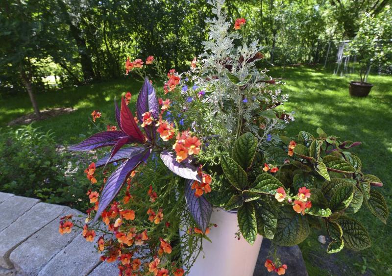 Sunlight glints off Persian Shield and Sunsatia Blood Orange nemesia in this stunning container design by Shelley Litman.