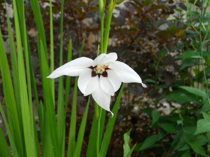 A striking linear arrangement that stretches almost four meters includes argyranthemum, morning glory, lisianthus, Tradescandia pallida, and Sweet Caroline Bronze ipomoea. The potted bulbs of Acidanthera (Abyssinian gladiolus) with their strongly sword-like foliage and white bi-coloured flowers will provide brilliant late season colour.