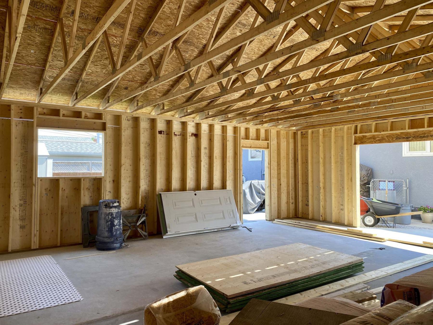 Delisle and I determined the 12-foot wide concrete pad extension would be completed before my services began. The concrete was poured the week prior to having the building materials for the garage package including trusses, delivered to the jobsite. The subsequent framing, sheeting, garage wrap, and installation of the steel man-door and 48-inch by 36-inch window fell on my shoulders. And on a sunny Monday, the framing began with Delisle as a willing building participant. The first 2x6 walls at nine feet were erected by end of day, and the remaining two walls on the next. The roof trusses were strategically manoeuvred and fastened into place on day three. By the end of the fourth day, the roof was completely sheeted which prompted the sheeting of the exterior walls on day five.