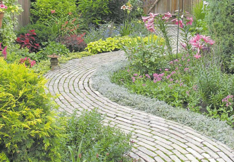 Walkways may be wide or narrow or include a variety of stones. Sometimes the design is reminiscent of a pattern that the homeowner admires or naturally gravitates to for one reason or another. Symmetry, for example, is often a component in the design of an herb garden. Shelley Walker is a member of the Herb Society of Manitoba and a volunteer at the herb garden at Assiniboine Park. The wide pathway that leads from the deck in her backyard to her garden is akin to a courtyard and suggestive of the geometrical design often found in formal herb gardens.