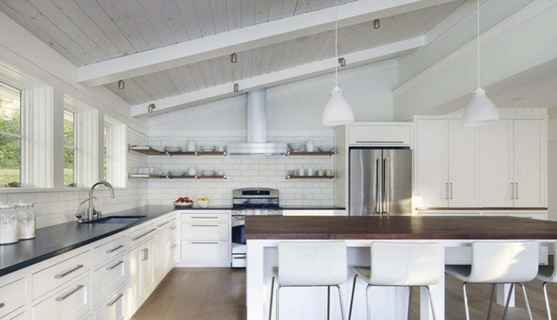 The countertops are dark granite, while the island is topped with walnut, the same wood used for the open shelving and the new stair rail.