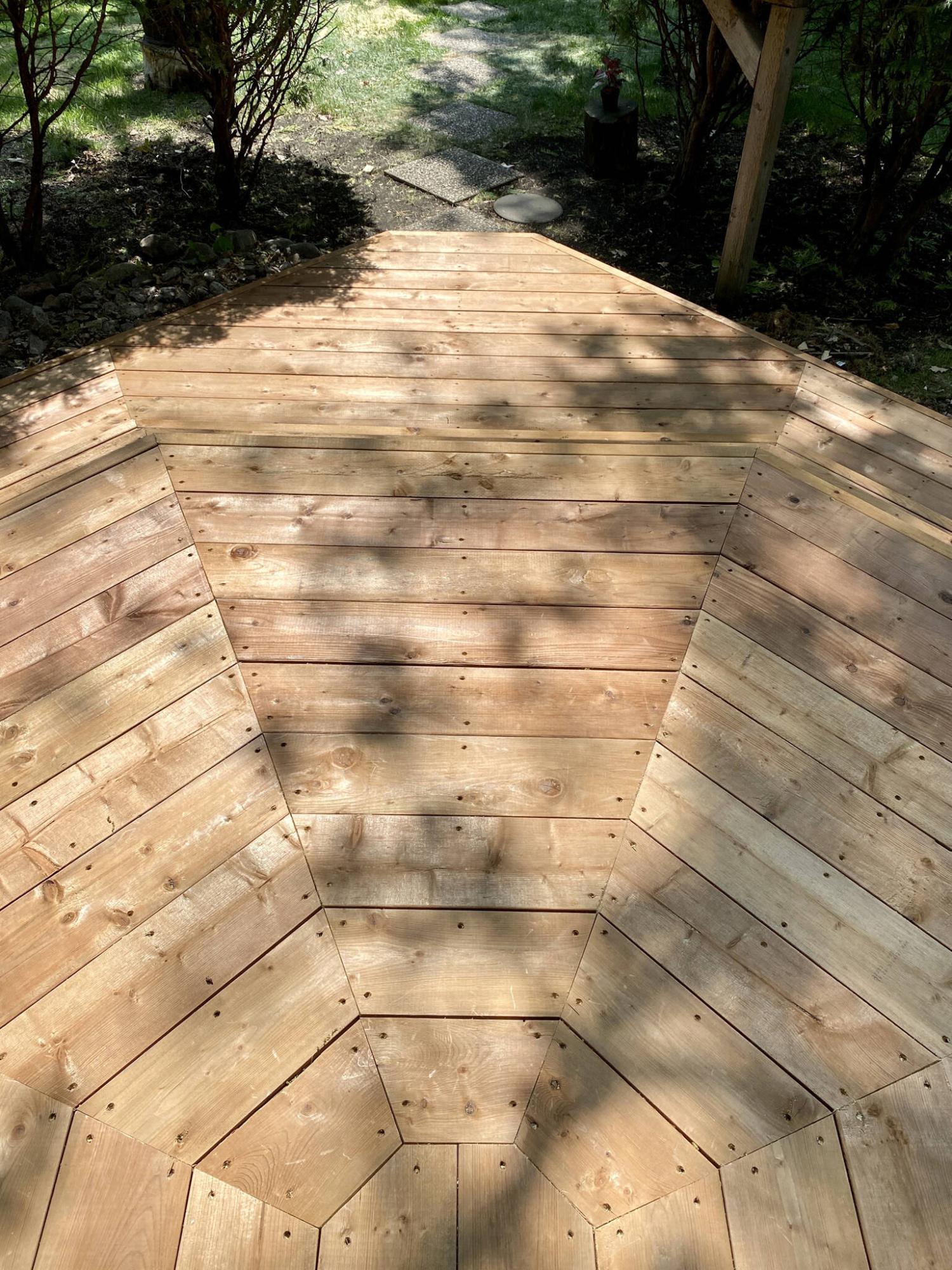 The upper tier and main porch area was the most complex to complete. It was necessary to start from the middle to ensure the top decking miters and angles remained integral as they are built outward towards to perimeter od the upper tier. As such, the first full octagonal array was created by using two temporary boards as spacers along the center of the upper tier width. Once this full octagonal was affixed to the framing, the inner board were then created with the proper custom mitered end (to meet the octagonal shape), subsequently fastened to the framing as well. From that point, it was simply a matter of working outward, carefully ensuring the integrity of the octagonal shape was maintained along every row until the final row of 2x6s was positioned along the outer perimeter of the upper tier.