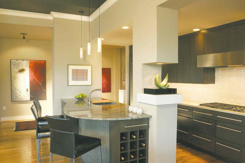This plan includes storage under the counter for wine and, from the kitchen side, a large cabinet for pantry items. (By omitting the wine storage there would be leg room for a fourth chair.) The slightly oval shape allows for angled views that keep everyone in touch with each other, and also facing open space rather than a wall. The lighting was planned so that pendants focus on the counter, sleek and simple.