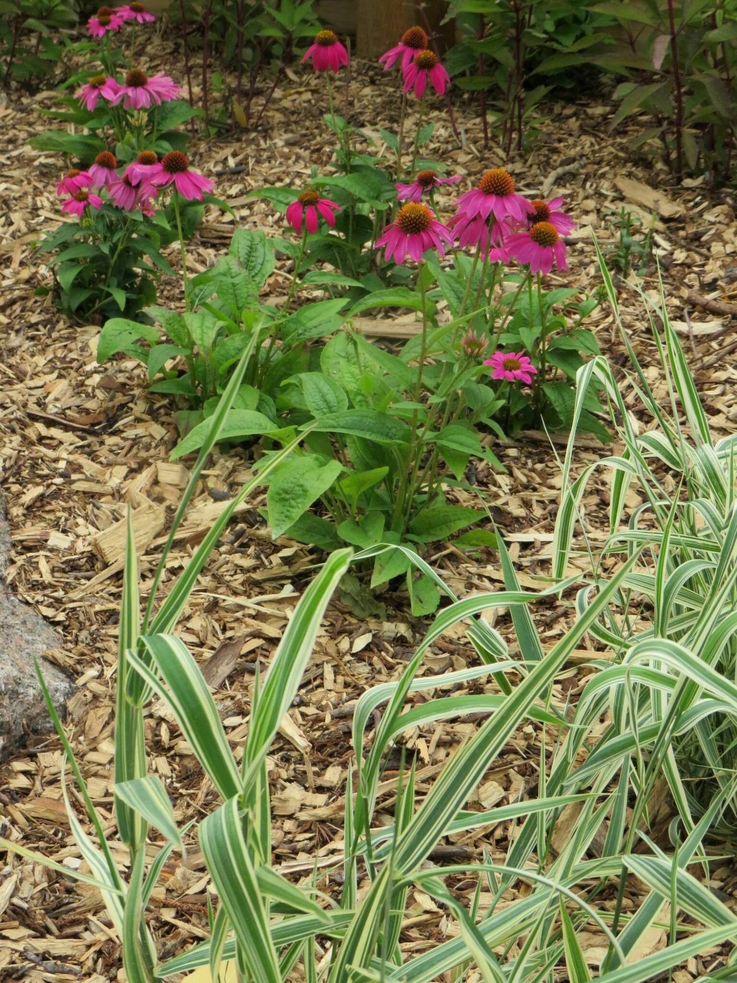 The art space is planted with Echinacea angustifolia Purple Coneflower, Eutrochium maculatum Joe Pye Weed, and Ribbon Grass (Phalaris arundinacea), a perennial bunchgrass with green blades striped with white. A mass planting of Joe Pye Weed, a tall variety that will grow to a height of 1.5 metres, will serve as a screen or buffer. Joe Pye Weed has many traditional uses and grows in damp meadows across southern Canada. Echinacea angustifolia coneflower is native to Manitoba.