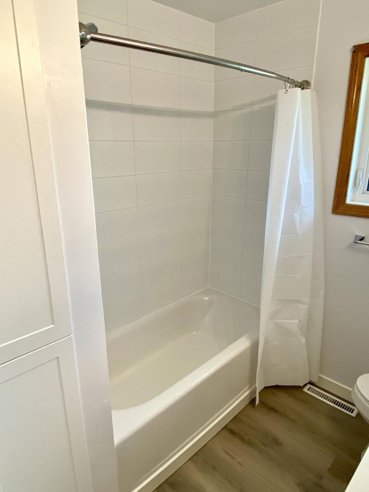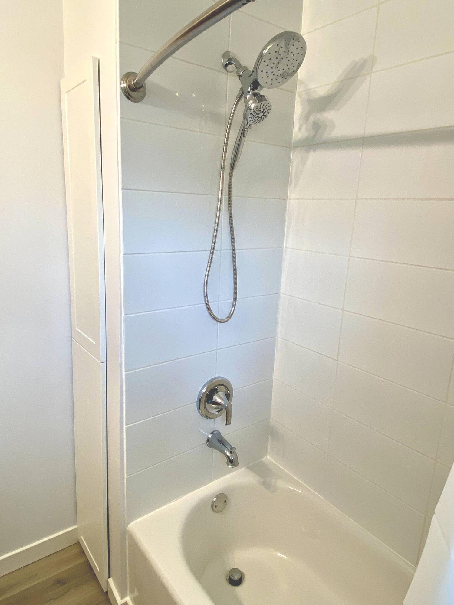 With the shell formally prepped, the shower stall was adorned with white eight-by-16-inch subway tiles set horizontally, atop the new tub. The tile was then grouted and the seams along the tub’s top edge sealed using silicone.