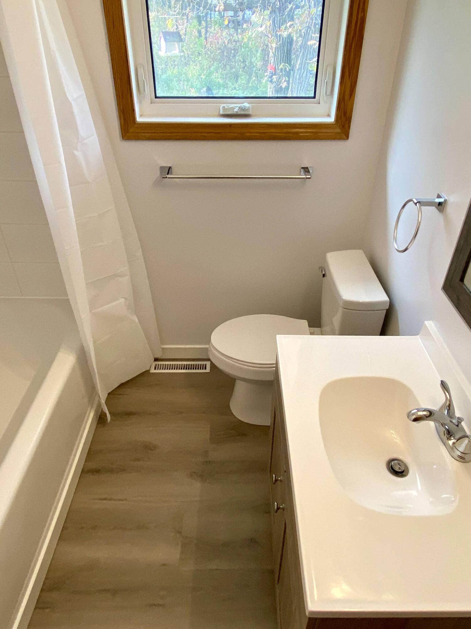 At a recent bathroom upgrade (part of a much larger project at an impending rental property), the existing space was in terrible shape. The ceiling and wall paint had begun to flake, discoloured from years of moisture. The tub, sink and toilet were badly stained from the hard water in the area. The electrical outlet was not GFCI. The old vanity was not centred during installation, and was offset from both the partially inset medicine cabinet and the vanity light fixture above it. The linoleum flooring was lifting along all seams and revealed a gap along the base of the tub. Every single water feed and drain revealed a minor leak of some sort, likely overlooked due to the bigger issue of water in the domicile’s basement, which was recently rectified by introducing a much needed sump pump to manage the elevation of the water table.