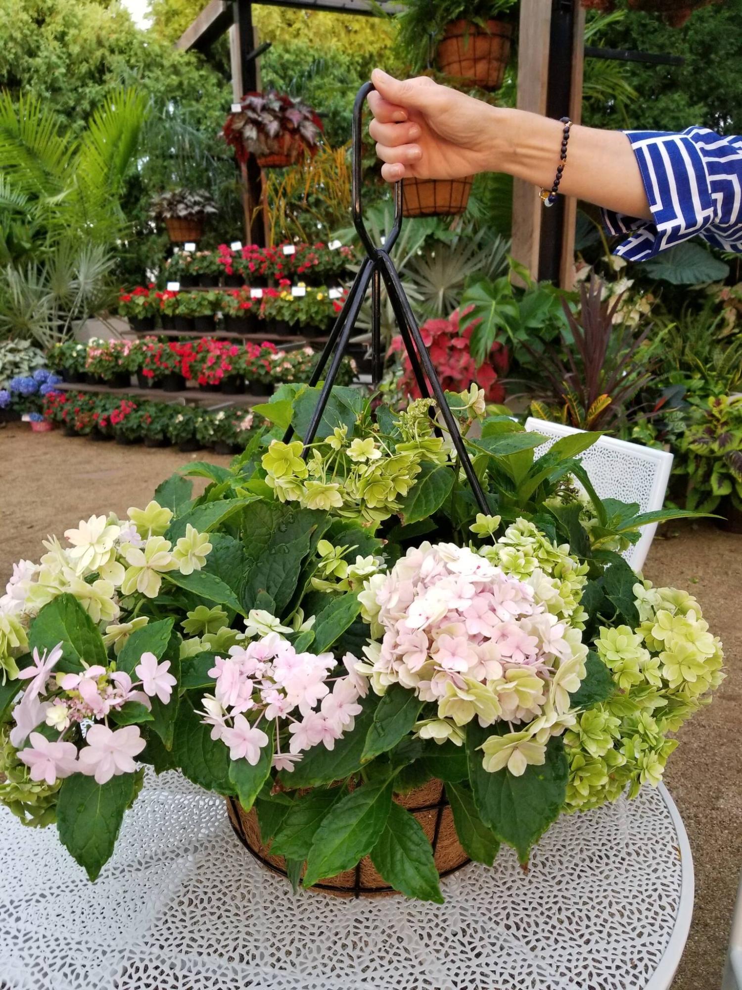 When I was in Chicago this summer visiting the gardens at Ball Horticultural, North America’s leading wholesale horticultural distributor, I saw Hydrangea Haba, a new double flowered mophead hydrangea for hanging baskets. I was with a group of garden writers from Canada and the US, and we nearly knocked each other over trying to get a picture of this new bountiful and floriferous hydrangea with its flowering stems spilling over the edges of a hanging basket. The excitement was palpable. Haba is from Hydrangea Breeders Association (HBA) which is based in the Netherlands. In 2018, Ball also brought us the Kanmara Hydrangea which was bred by HBA. Like the Kanmara, Haba is meant to be grown as an annual.