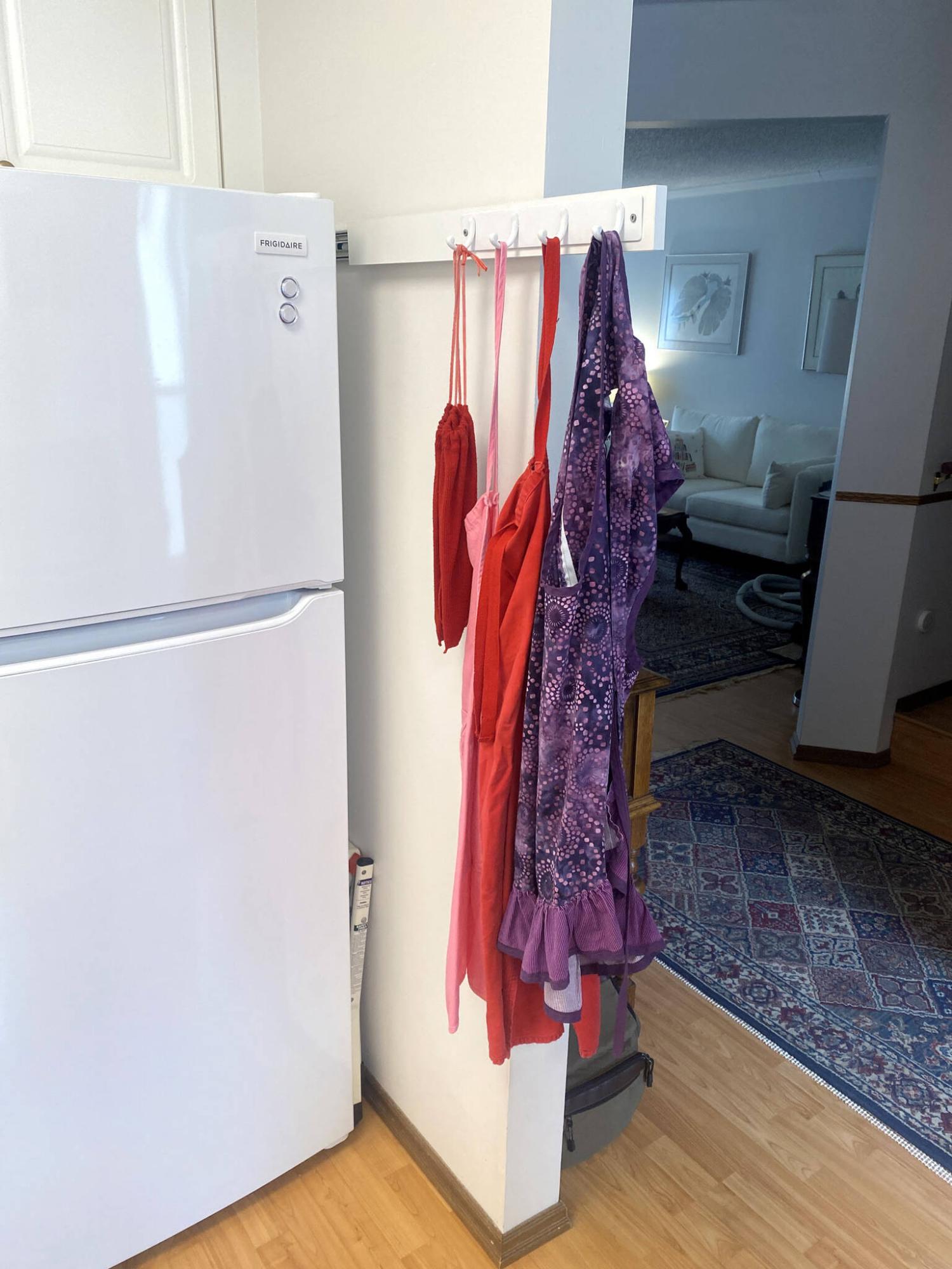 A new custom retractable apron hook was fashioned and mounted at the gap between the left side of the fridge and the far wall.