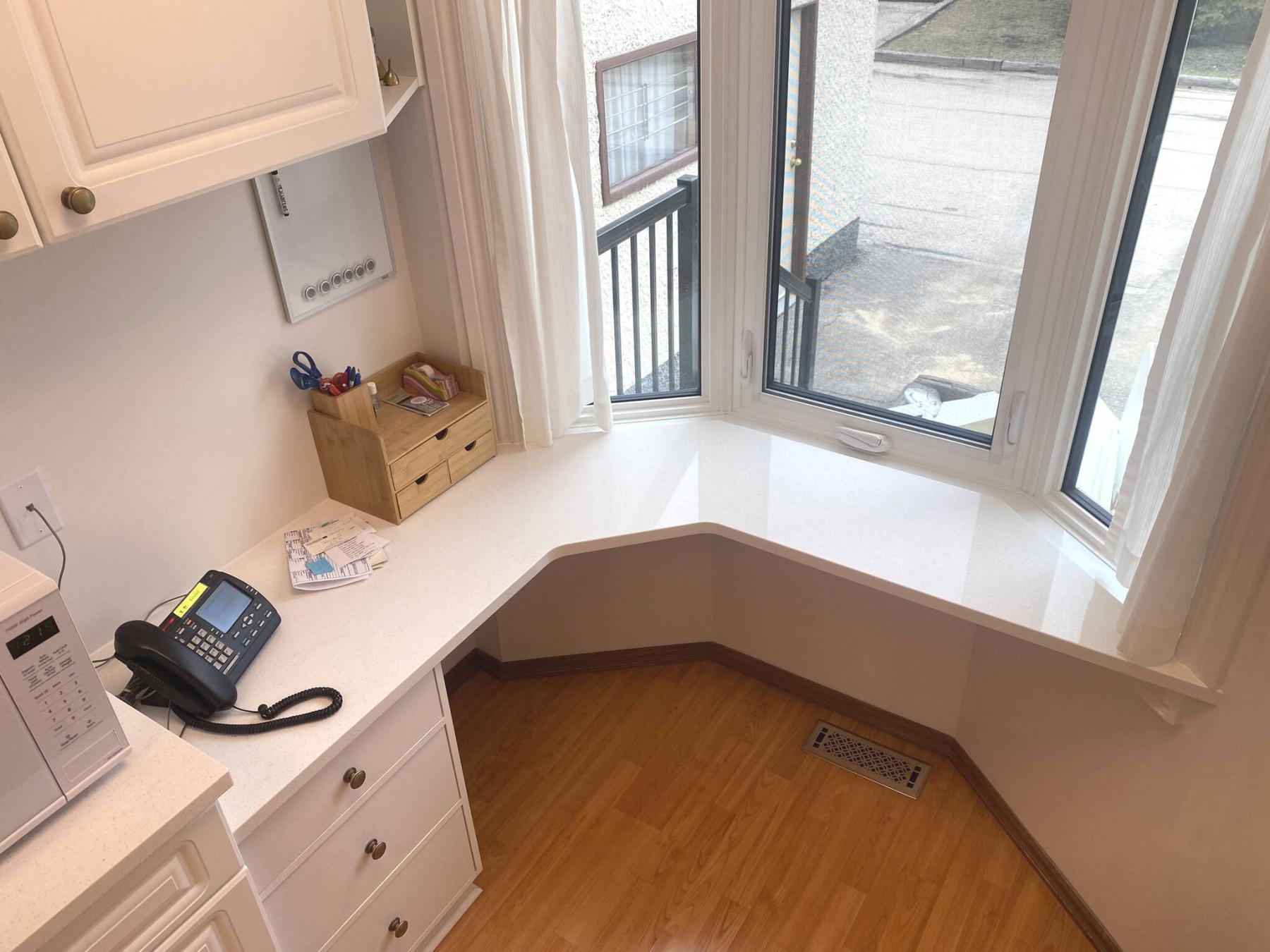 Unlike the old countertops, the new quartz meets the bay window angles precisely.