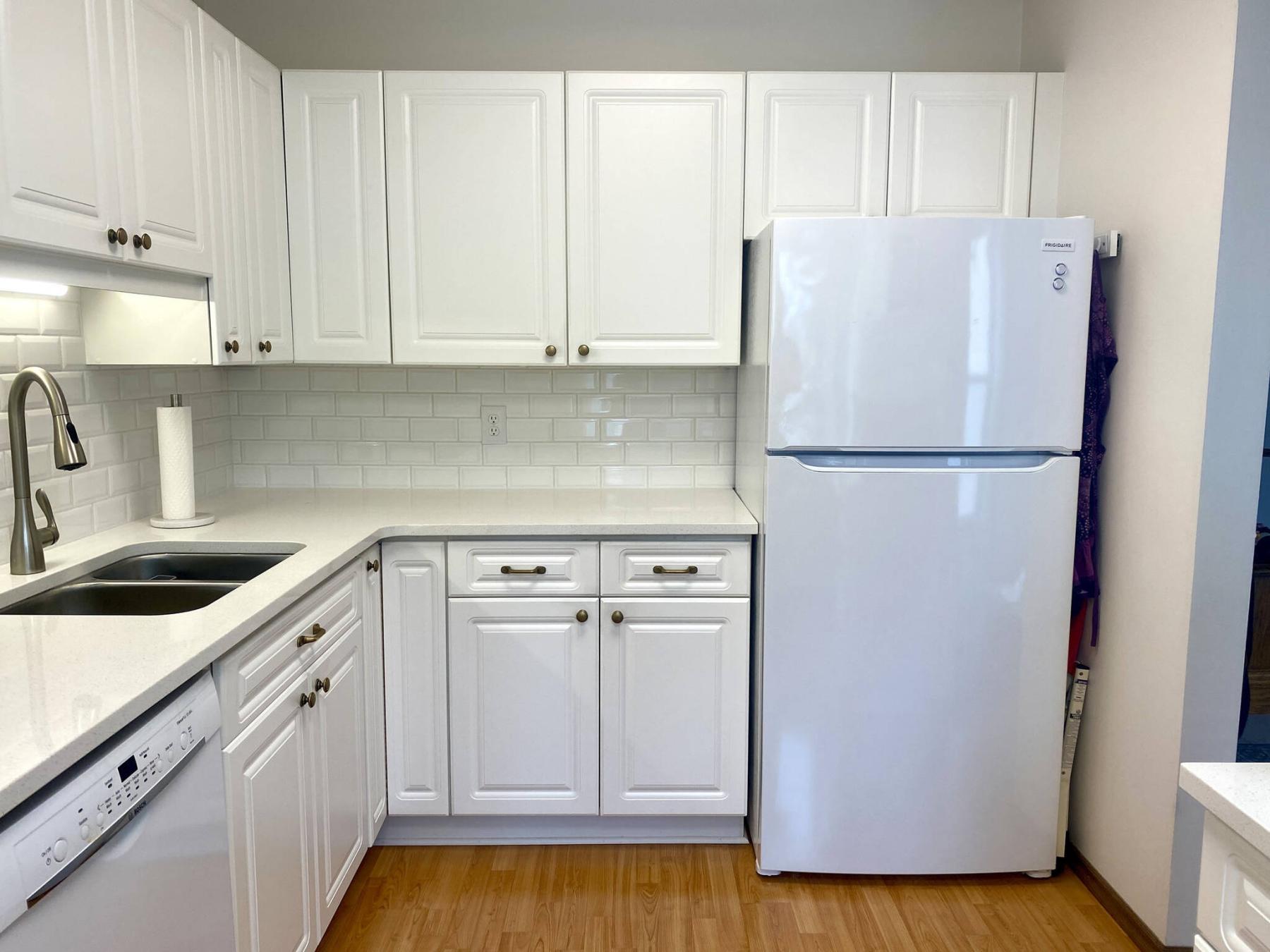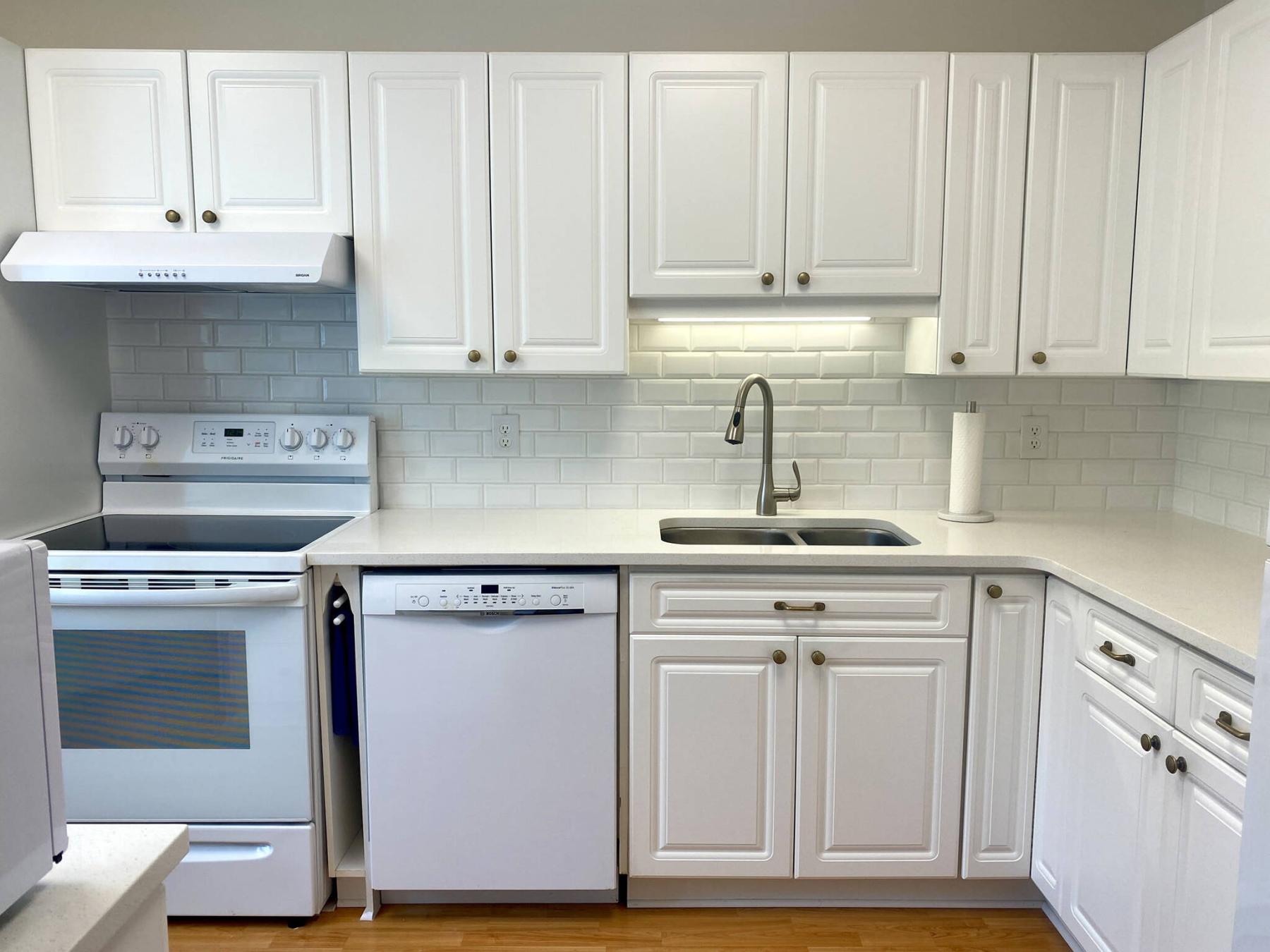The first modification entailed replacing the existing Arborite countertops with quartz. The old Arborite had begun to peel up in certain areas, especially at the seams. As such, the main L-shaped counters along the sink and fridge walls received new white-quartz tops, along with a new undermount stainless-steel sink and pull-down Moen faucet.