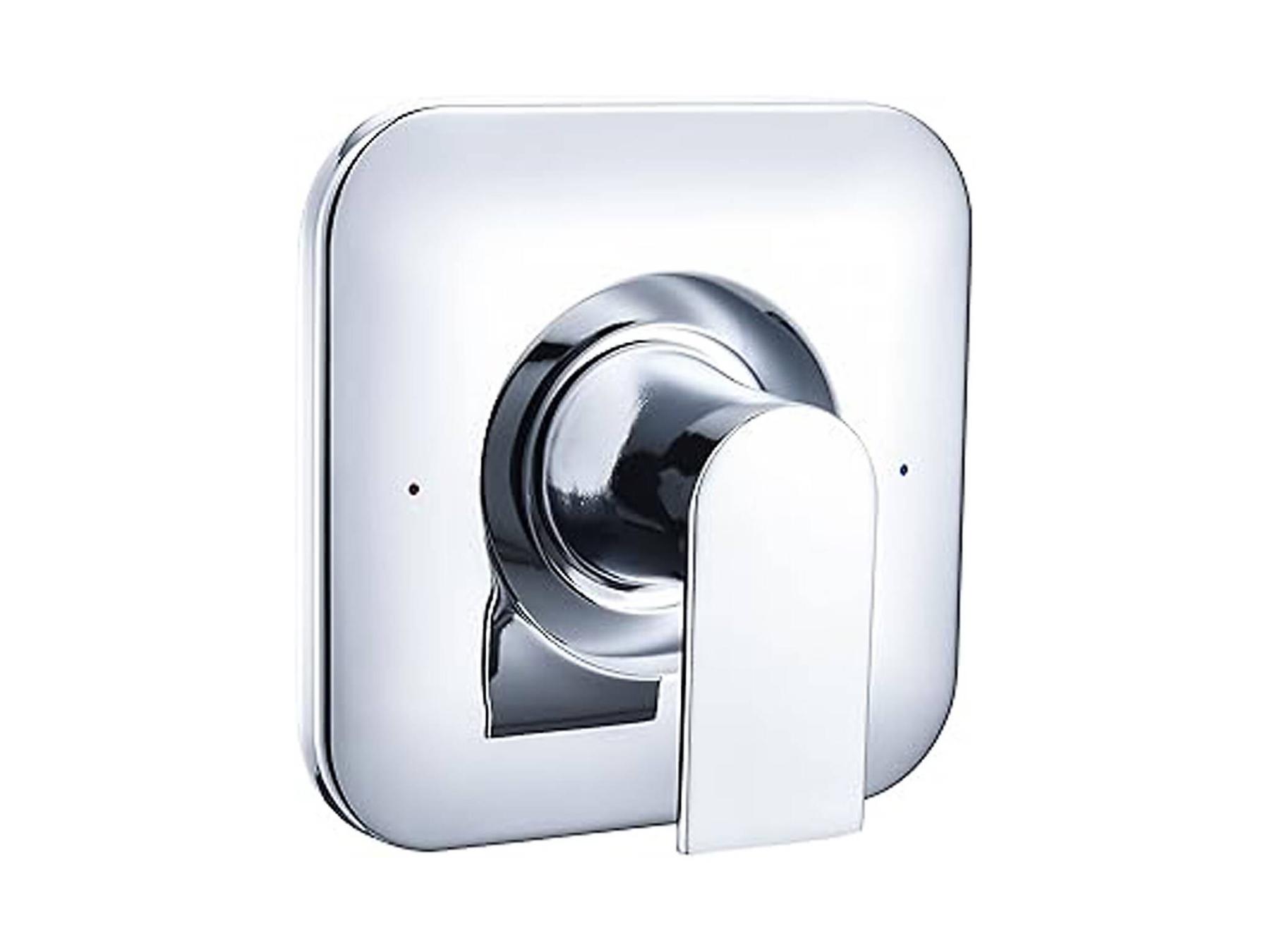 A square Moen trim plate with rounded corners and sleek handle replaces the old and worn-out trim and handle original to the bathroom.