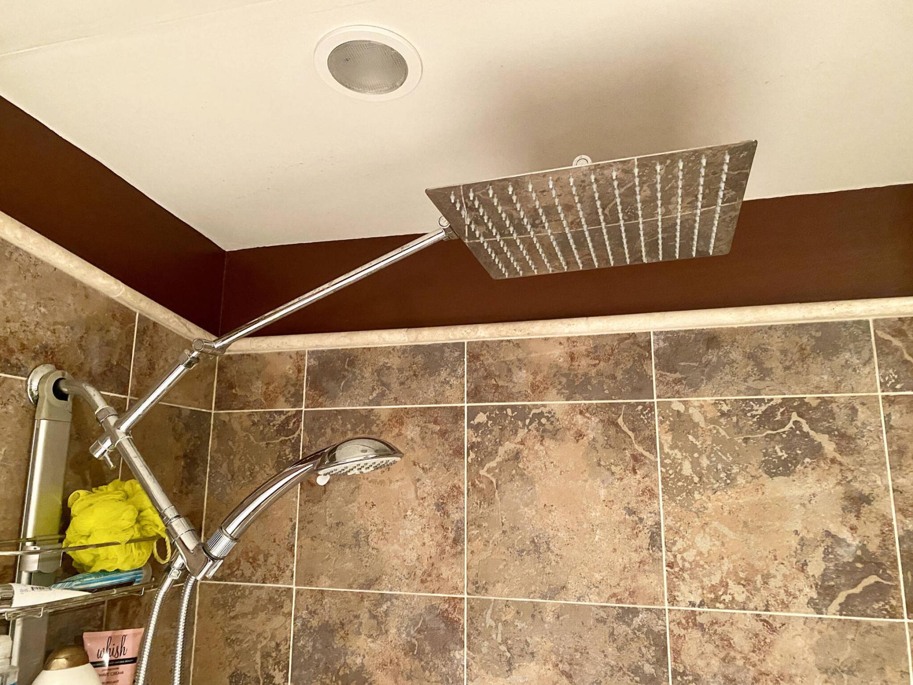 A 16-inch rainfall shower head is installed above a multi-flow shower head that doubles as a hand wand.