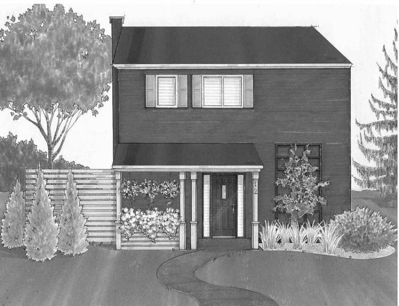 I've created a long porch area that will connect the stairway going to the existing deck, the actual concrete S-shaped walkway to the street and the pathway on the right leading to the driveway in the back. This last one will be situated between the wall and the new flower bed.