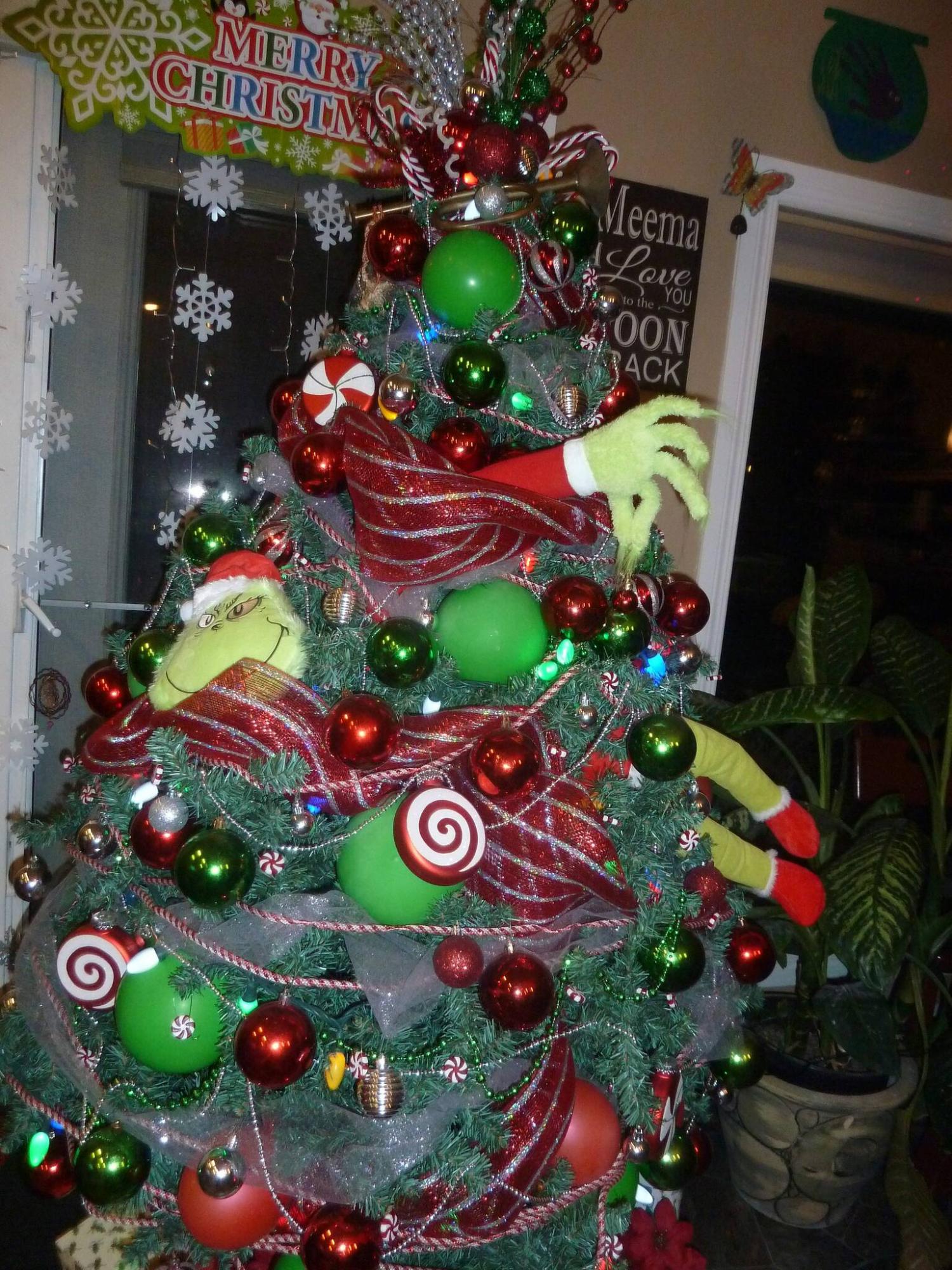 “I’m a bit of saver, and when this dear old tree got beyond decorating in the usual manner, rather than throw it out I decided to give it new life by redefining what ‘had’ to be on the average Christmas tree and turned it into the most magnificent Grinch tree ever created.