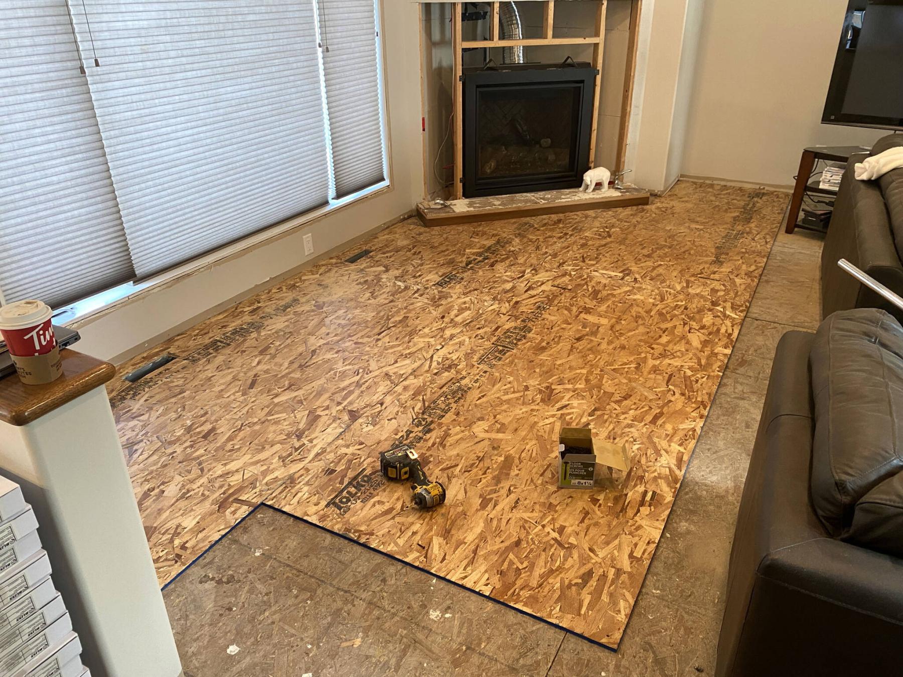 With both non-linoleum areas prepped, it was easy to confirm the elevation difference was indeed seven-16ths of an inch. After calculating the square-footage of secondary sub-floor needed, 14 OSB boards at seven-16ths-of-an-inch thickness were delivered to the job site.