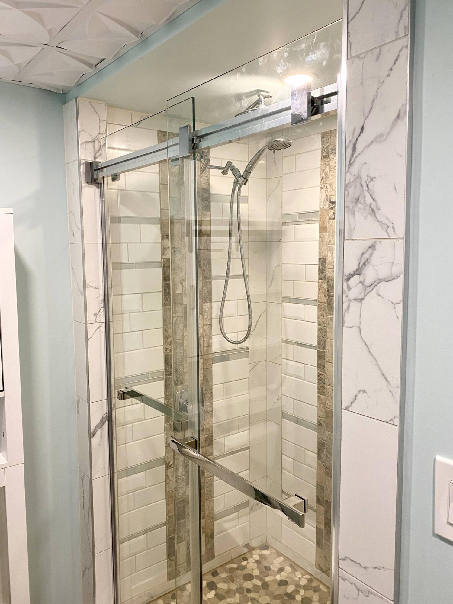 Once fully grouted, the shower heads, faucet and double-sliding glass shower door were installed.