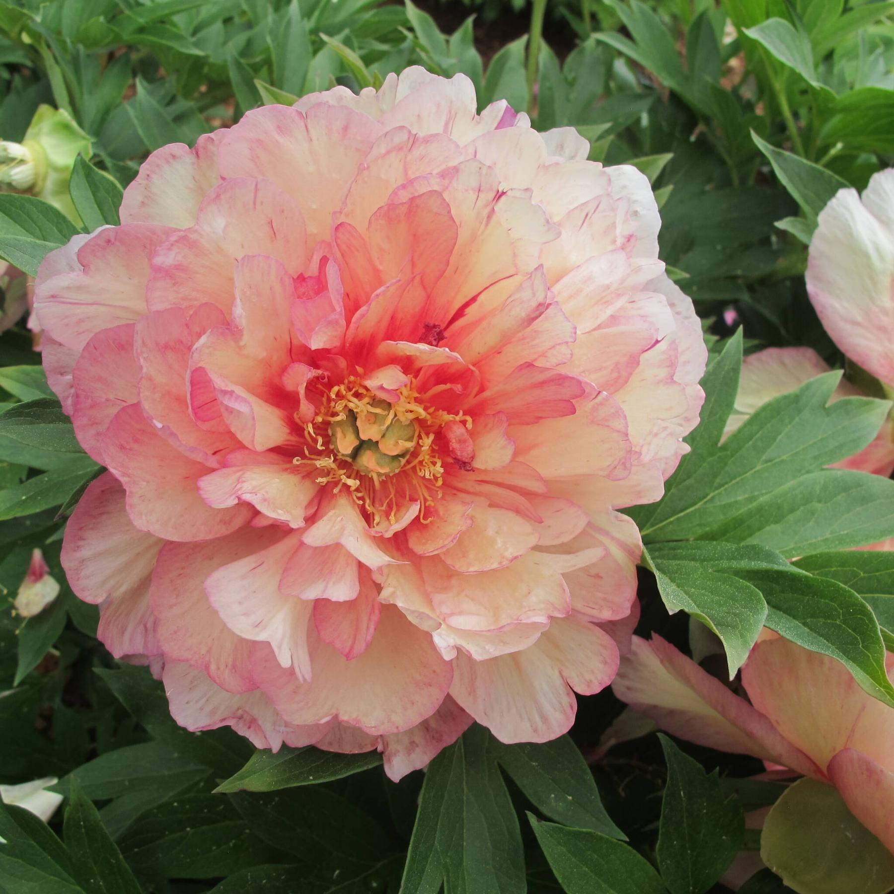 Itoh peony cultivars can vary in size from 90-101 cm. The new Garden Candy series from breeder Donald R. Smith is the first series of Itoh peonies with a consistent size of 91-cm tall and wide. Each one of the compact cultivars in this new series boasts large double flowers. The range of colours is heavenly.