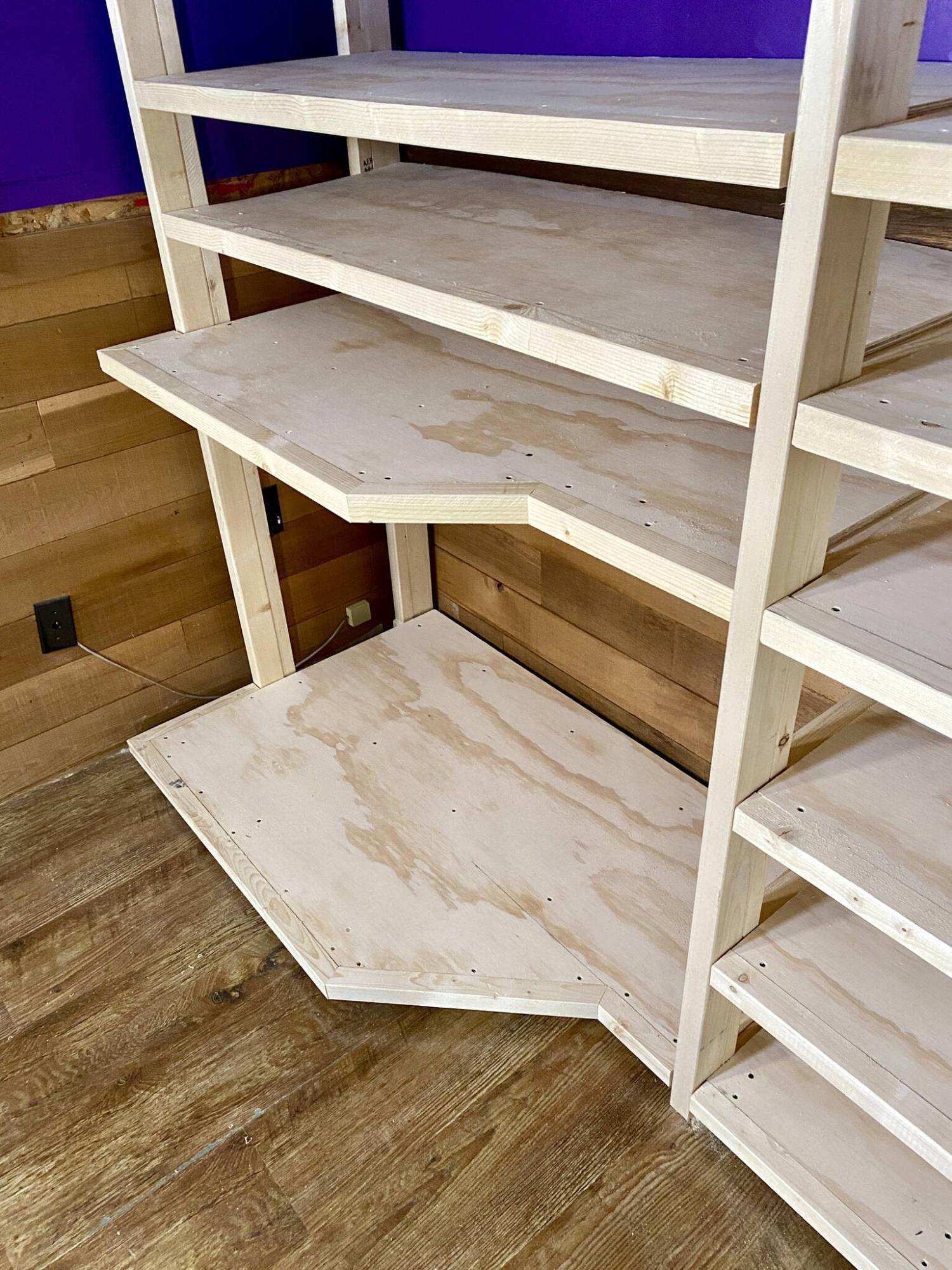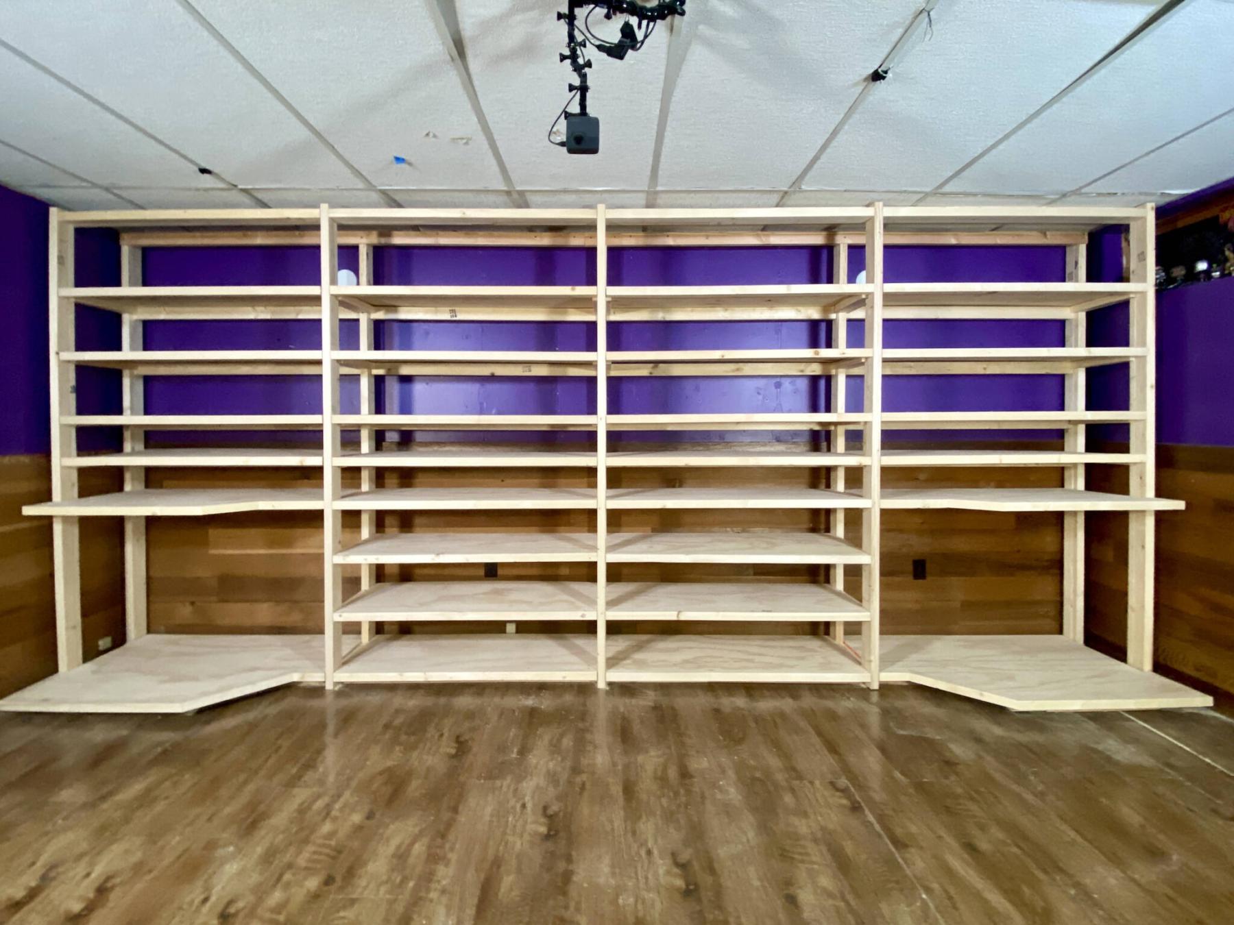 Once the vertical supports were assembled with the 2×4 cross members, the base and top framing were constructed using arrays of 2×3 lumber, ensuring the spacing between the vertical supports remained consistent at just better than 48 inches. With the structure’s framework taking shape, the plywood shelving including the outer sections with protrusion design along the base sections were permanently affixed to the framing. The midway outer shelving with reducing protrusion and compliments the lowest outer shelf was also affixed to the framing, providing ever increasing rigidity to the entire structure. The remaining shelving was simply placed along every 2×4 reveal along the verticals, as these shelves would remain removable.