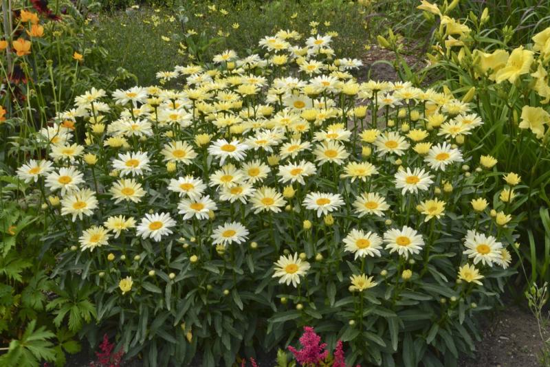 Shasta daisy is a shorter-lived, sun-loving perennial although its life span can be extended by dividing its clumps every few years. Becky is one of the best known varieties. Banana Cream, a variety that may be closer to zone 4 hardiness, is as delicious looking as it sounds. Its large blooms, bright lemon yellow when they first open, lighten to a creamy white, blooming from July to September. Shasta daisies will not tolerate wet or poorly drained soils. A location with good drainage is particularly important since Shasta daisies won’t tolerate wet or poorly drained soils. Mulching heavily in winter can cause crown rot. Crowns, instead, should be loosely covered with whole leaves, pine needles, or evergreen boughs once the ground is frozen.