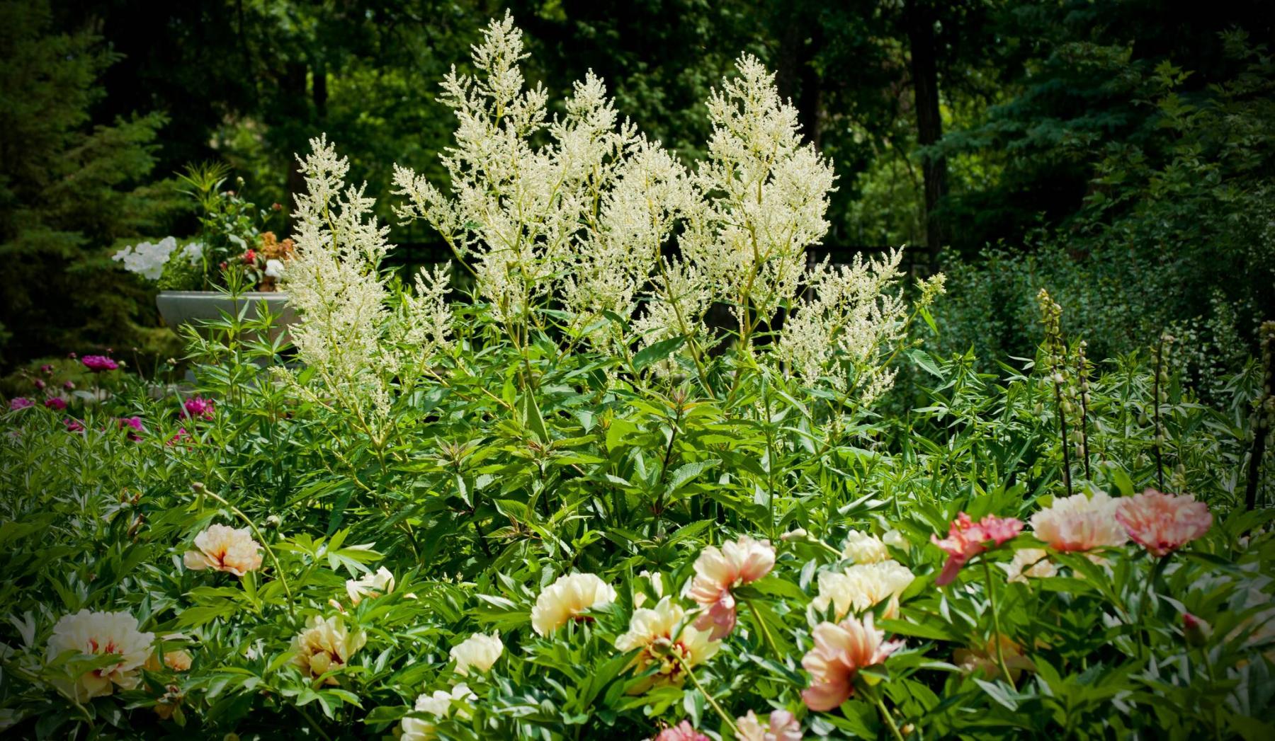 Backdrops, of course, set the stage in any garden design to enhance the visual impact of flowering displays. Behind the sweep of Callie’s Memory peonies in the English Garden stands the mighty giant fleece flower (Persicaria polymorpha) which is currently in full, majestic bloom. Featuring large plumes of creamy white flowers and dark green, lance-shaped leaves, giant fleece can grow to 1.8 metres or more, which is contrary to the smaller size (90 to 120 cm) suggested by some nursery catalogues or plant tags.