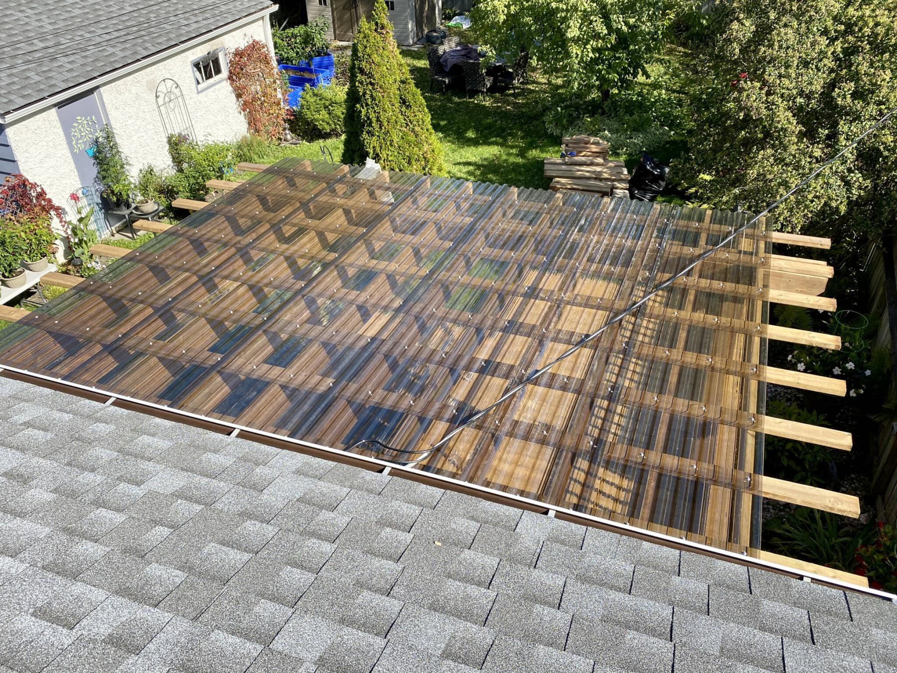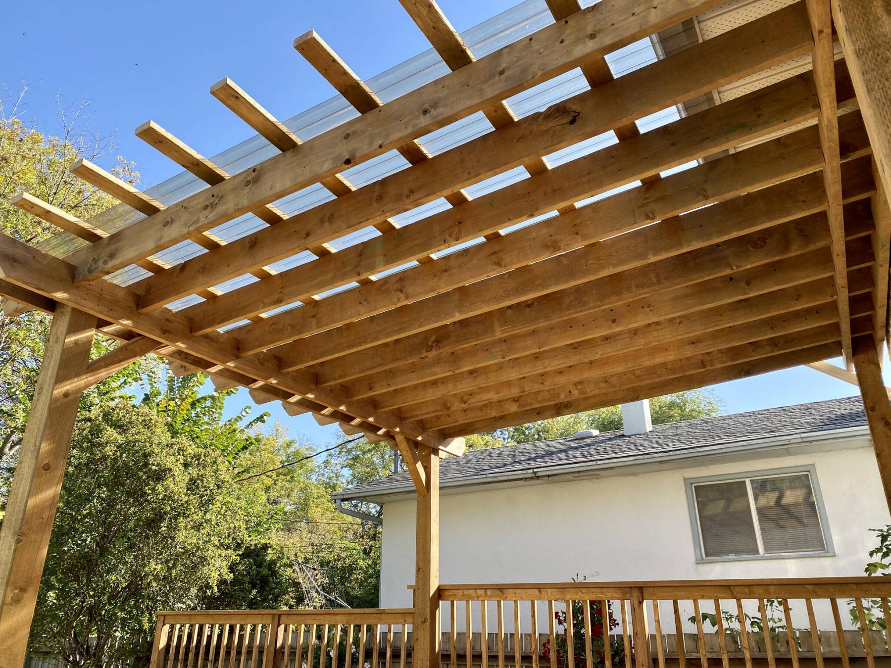It was a glorious morning, and the pergola build went very smoothly. The back 6×6 posts height was established to allow roughly two inches of clearance below the soffit once the upper veins, cross-veins and roof panels were installed. The front posts were cut roughly 12 inches shorter, providing a gentle downward grade from the house. The tandem 2×8 pre-notched support beams were fastened to the front and back pair of posts, and set into position. The upper 2×8 veins were cut to match the angle of slope, notched to fit atop the tandem beams front and back, before being set into place one by one. The 2×4 cross veins were then affixed to the topside of the veins at 12-inch intervals creating a checkerboard pattern. With all lumber in place, six 12-foot smokey clear corrugated roof panels were fastened to the top of the 2×4 cross-veins, overlapped on the long, tucked roughly eight inches below the soffit and eaves. This deck and pergola combo culminates into the perfect backyard haven.