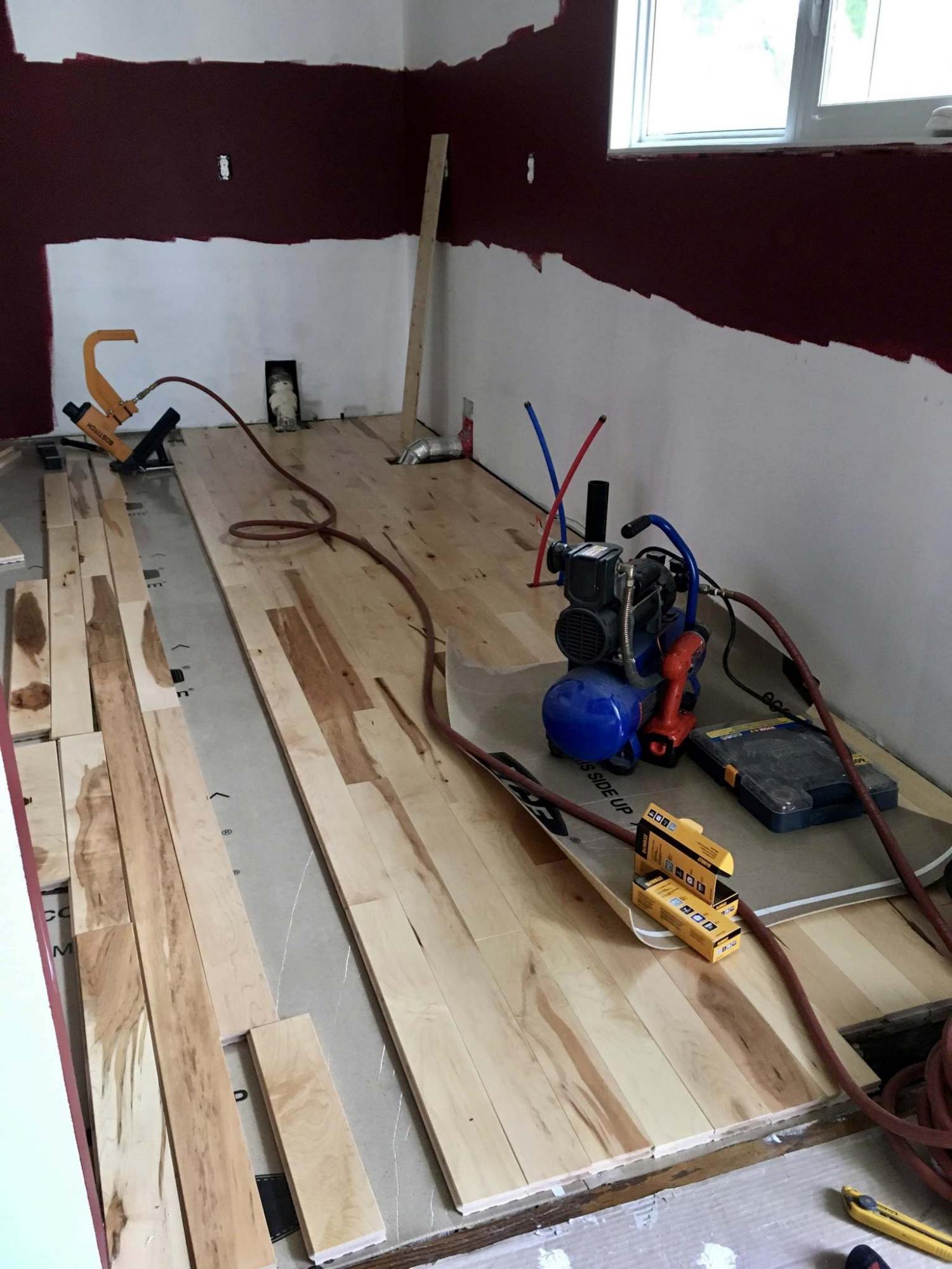 Prepped and sanded — the shell began to transform with a few coats of paint and rustic hardwood flooring.