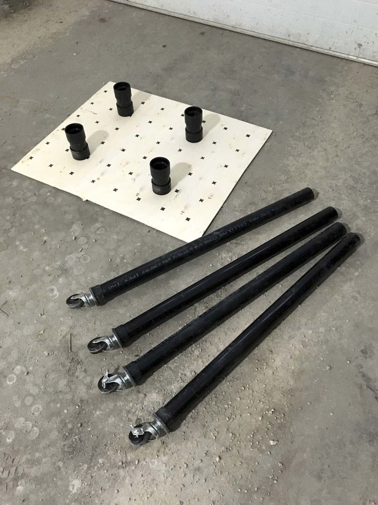ABS pipe sections and castor wheels were used to increase the height of the mobile butcher block just enough to surpass the height of the kitchen island, and provide mobility.