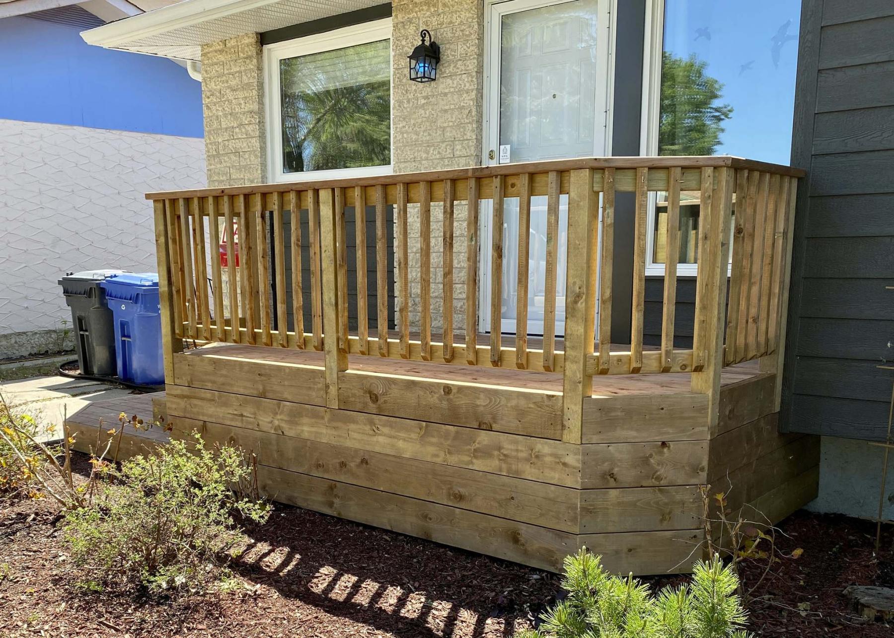 Finally fascia is placed between every post along the exposed perimeter edge of the upper tier and 2x8s are also fastened to the face of every stair elevation, continuing along horizontally at every height to create a porch skirt, fully enclosing the structure to ground-level. The finished porch now provides a sitting area along the face of the house at a six-foot depth, with ample access to the porch and front door from virtually anywhere along the landing and cascading stairs.