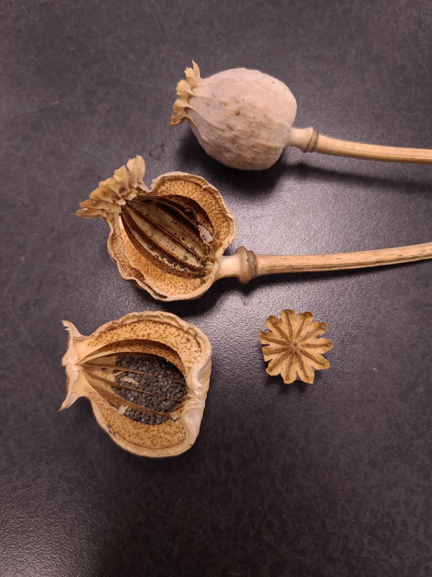 When the poppy capsule opens at maturity, says Zelmer, each carpel has its own doorway through which the tiny seeds disperse. “This works a bit like a saltshaker,” she says. “The seeds sift out over time.”