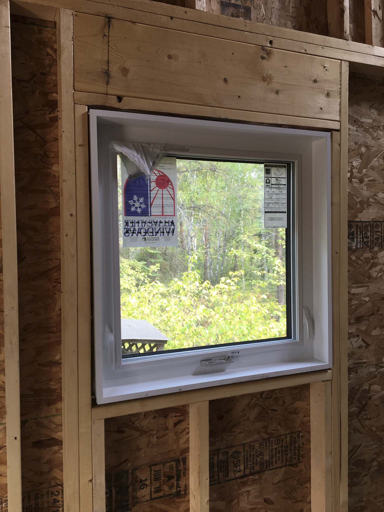 Once the windows arrived on-site, the installation task was quite simple. To expedite the process, the base of the rough opening was pre-shimmed to level so that the window would sit nearly centred, top to bottom, within each rough opening which was framed three-quarters of an inch wider and higher than the actual jamb size of each window. With the window resting atop the shims, it is also centred left-right and proper level and square were again confirmed before the window was tacked into placed by securing a few screws along the outer nailing fin, to hold the window in place. The window was then permanently secured with screws at every second hole along the entire perimeter nailing fin.
