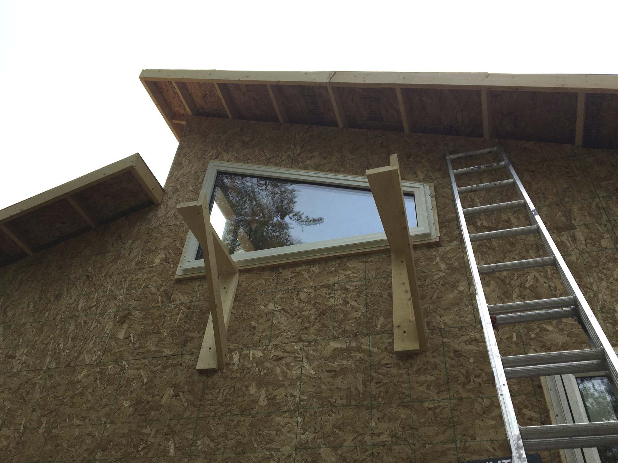 This five-foot-wide and three-foot-high rakehead window is first hoisted into position using the interior scaffolding, angled out onto temporary supports, before being placed into the rough opening and secured into place — it took four of us to achieve this!