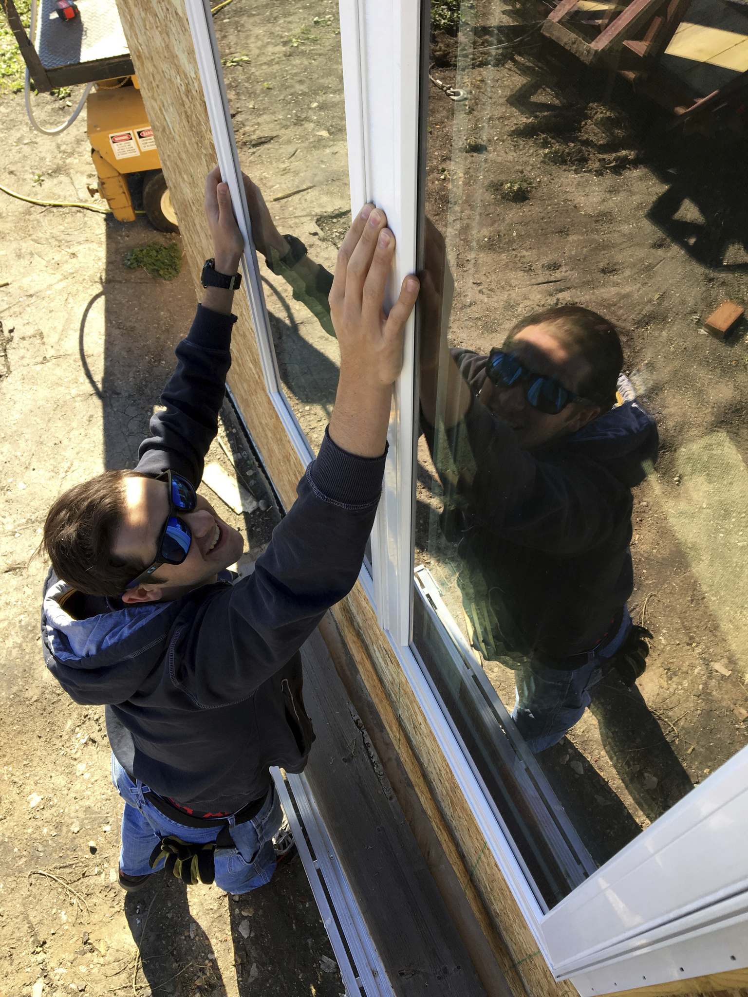 It is often necessary to have a second set of hands to hold a large window in place within the rough opening until it can be fastened — Edward Doiron, my cousin’s eldest, came to lend a hand (well, both hands) during the south-side addition.