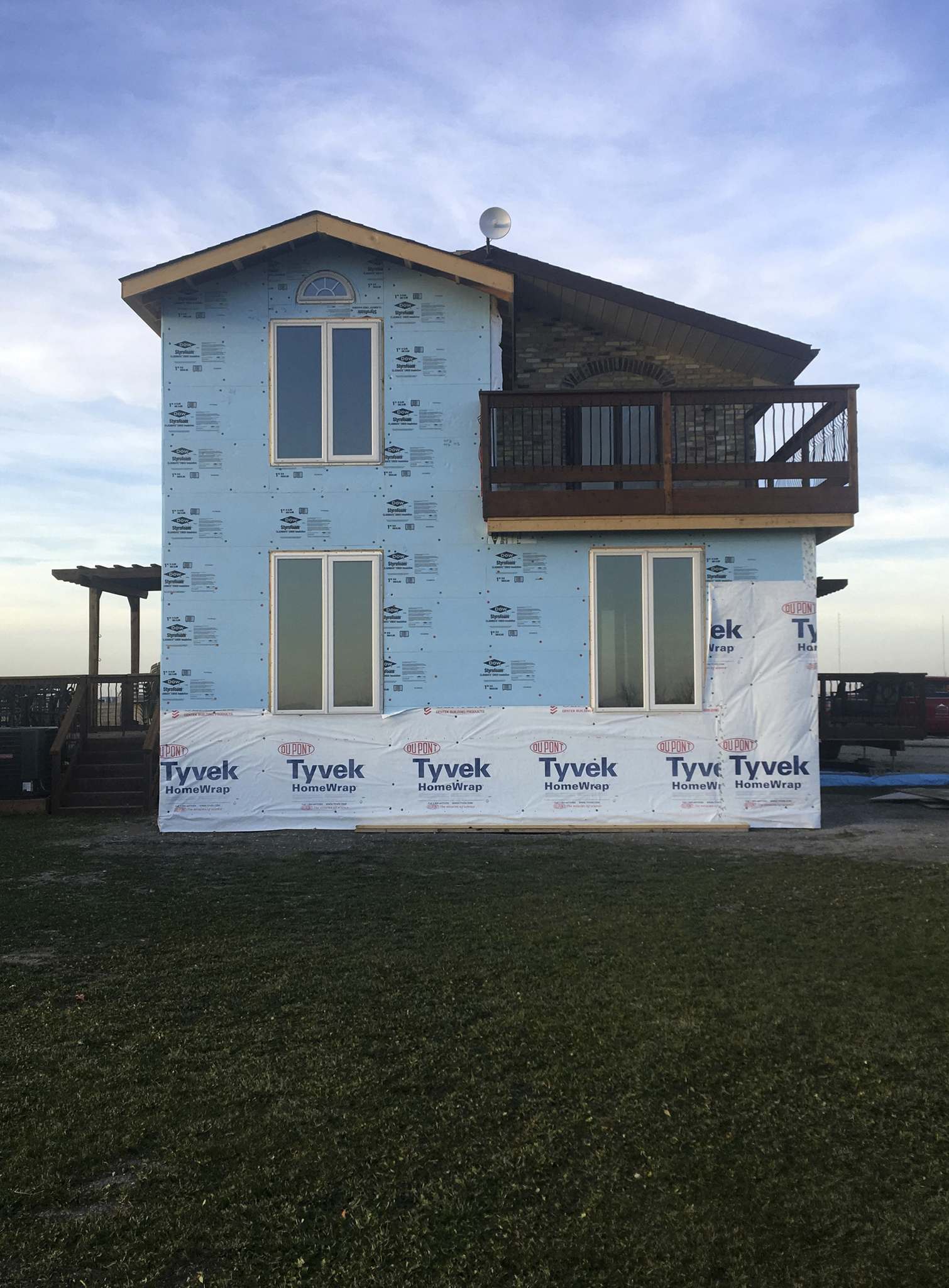 Once the windows were installed on the south-side addition and the one-inch rigid insulation was installed, the Tyvek housewrap was eventually sealed along each window perimeter with Tuck tape.