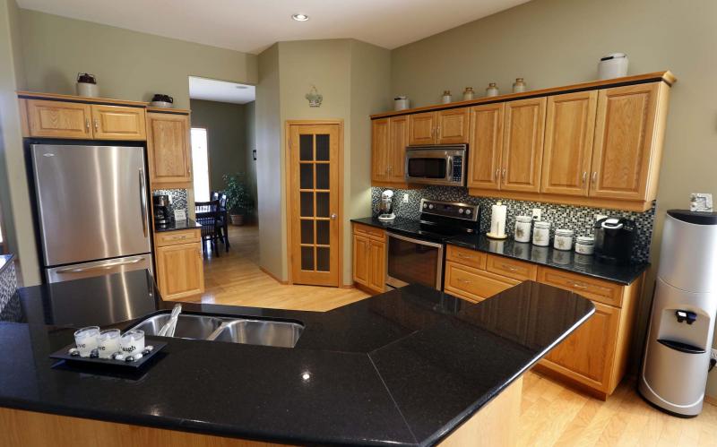 The kitchen offers loads of cabinets and a walk-in pantry.
