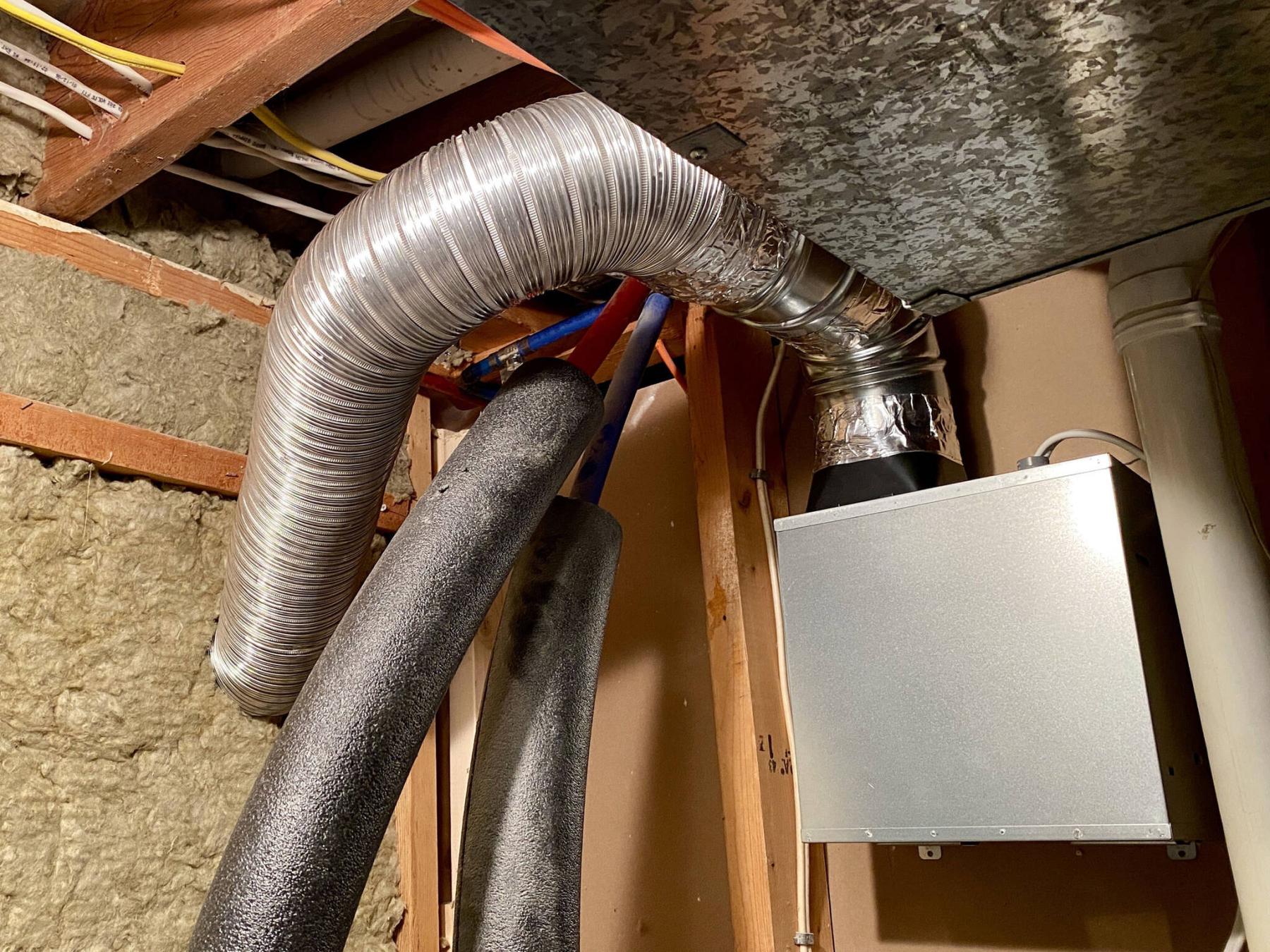 In lieu of a ceiling application, the bathroom exhaust fan is mounted vertically along the top of the wall adjacent the utility room, to allow proper venting.