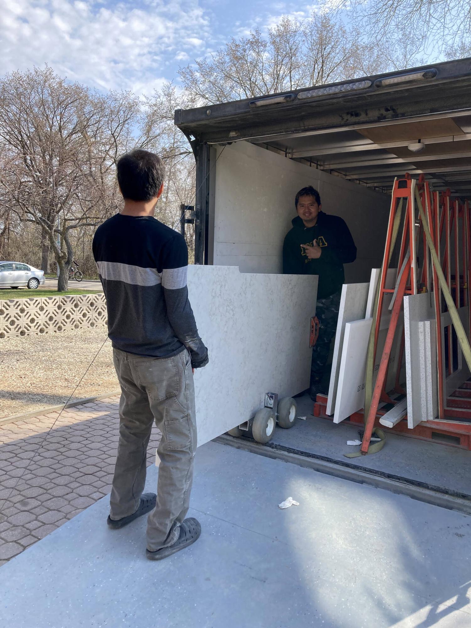 The heavy sections of quartz countertops are wheeled in using a dolly.