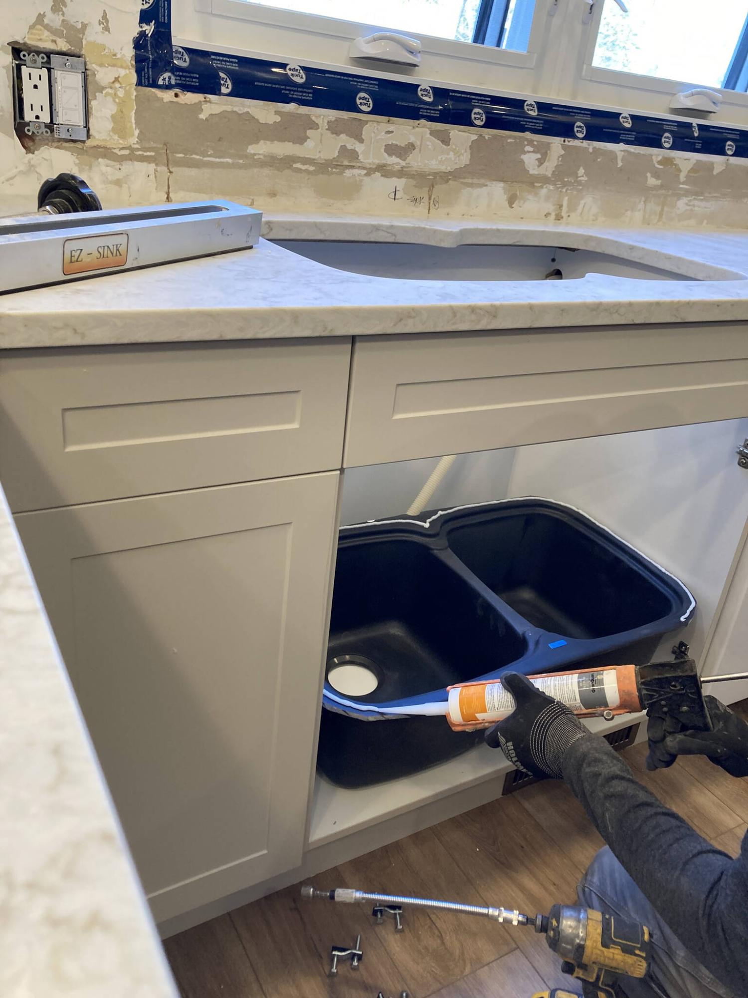 The sink is pre-loaded with adhesive along the upper edge before being lifted into place and fastened below the pre-cut sink hole.