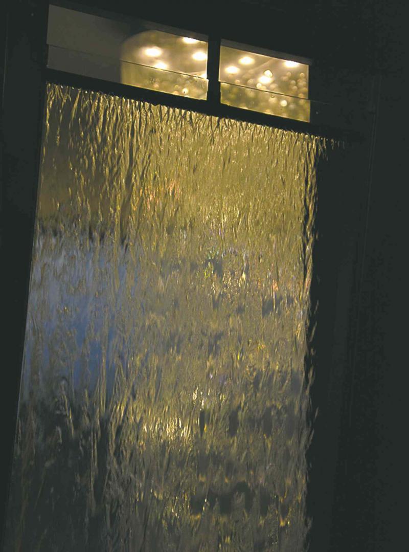 The stairway is of wood construction covered with 12-mil tempered glass treads and mirror risers. To the right is a waterfall that cascades over 11 feet from the living room to the floor of the foyer. A long chandelier of lead-crystal balls and LED lights hangs from the ceiling and illuminates the entire area with a prism of colours.