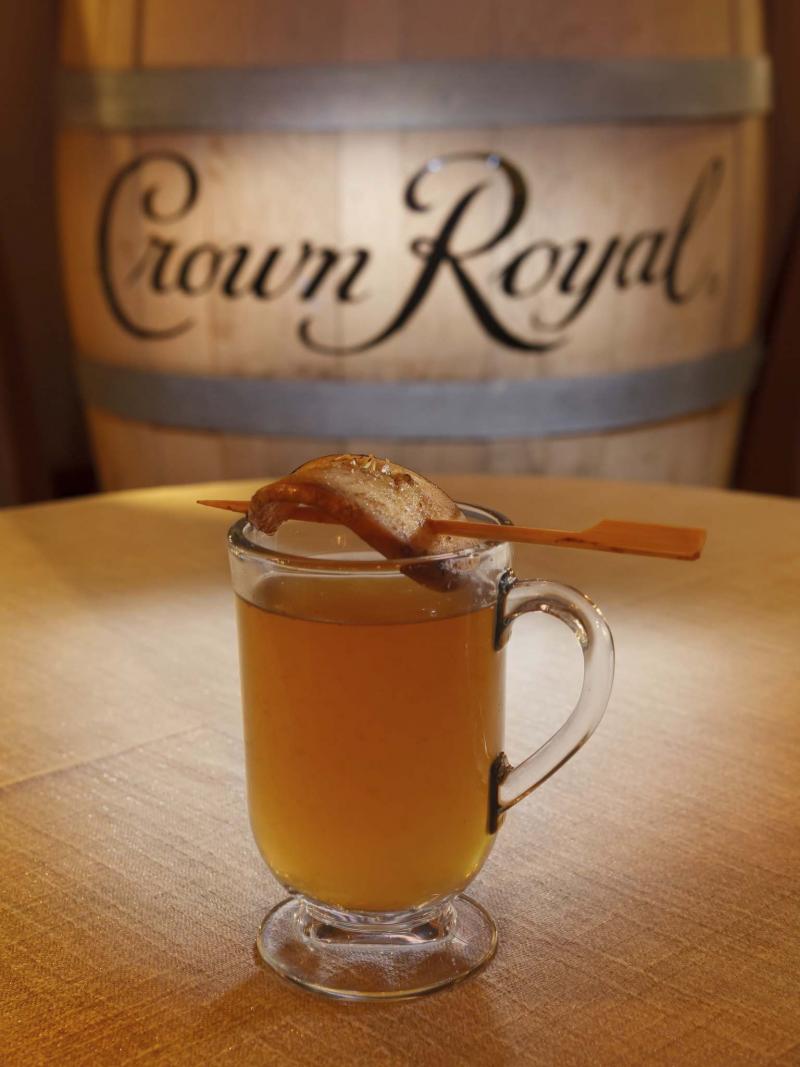 Turn the slow cooker on the warming setting and allow the character of the spices to permeate the entire liquid for about four hours, Carleton recommends, timing the process so it is ready when your guests arrive. To serve, he pours 15 to 30 ml of Crown Royal whisky into a coffee mug, then ladles the warm mixture over top and garnishes with a skewered apple slice, rolled in cinnamon sugar.